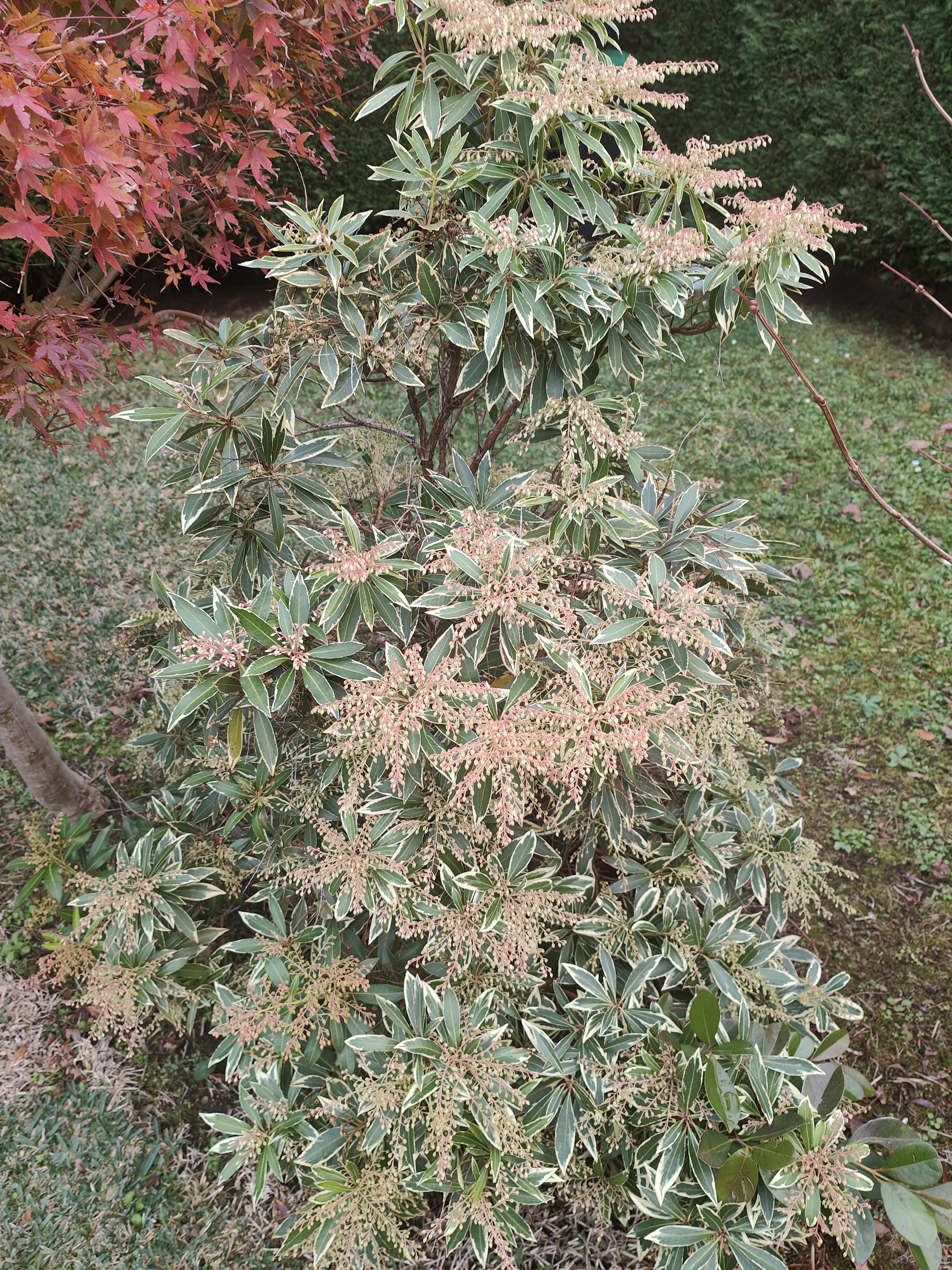 Y éste es un Pieris, un pequeño arbusto de hoja variegada que tiene un monton de capullos como podéis ver, las flores no son nada del otro mundo, diminutos farolillos chinos, pero se llena de ellas