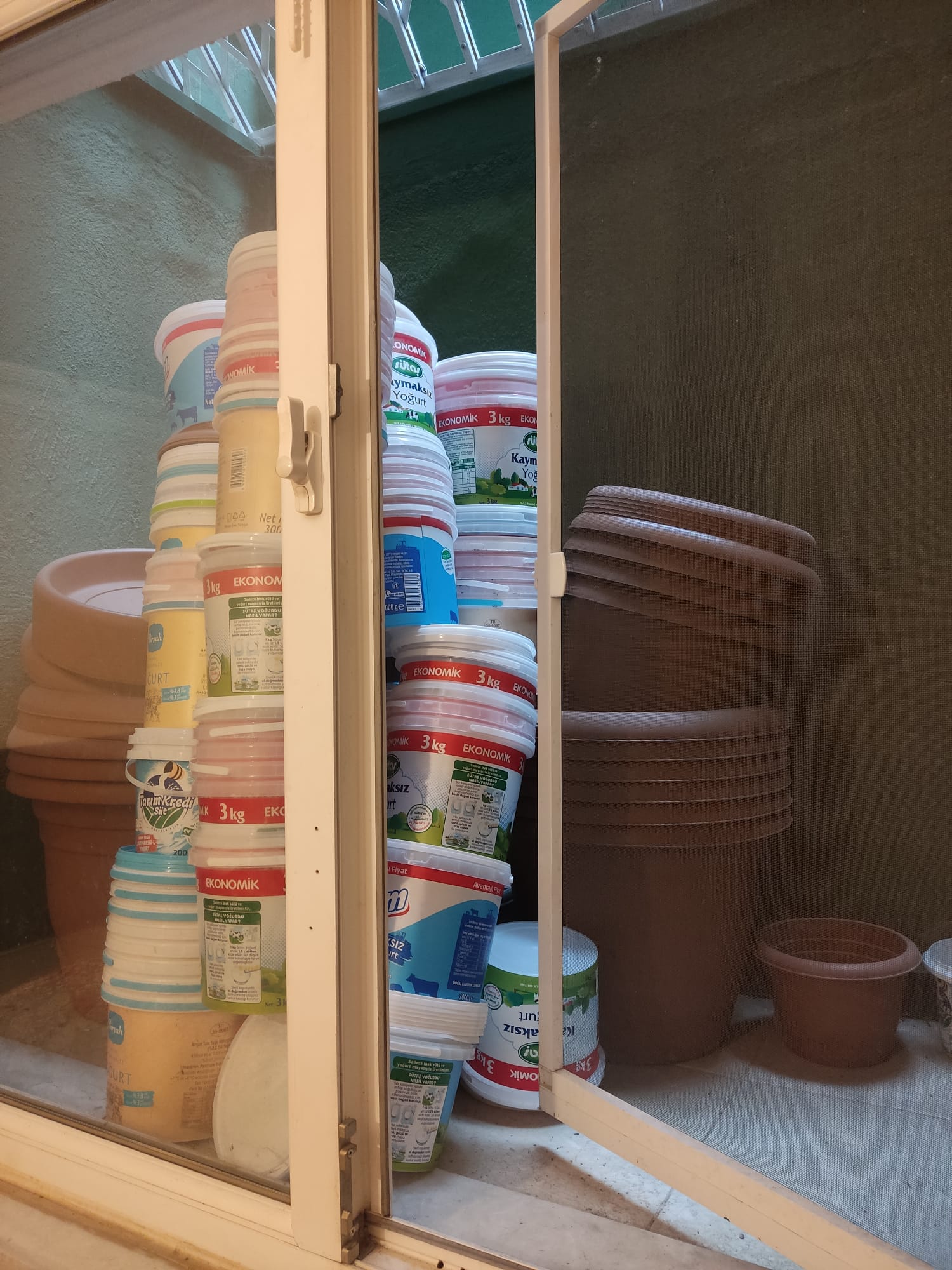 Me guardo todas las tarrinas de 3 kg de yogurt. Pero es que no las estoy usando a penas, se pueden poner en menos espacio si se clasifican un poco pero es que no se si tirarlas, la verdad ni molestan ni nada incluso podría pensarme en vender las crias de agaves si las planto ahí aunque sería muy antiestético poner eso en el patio de la casa en el jardín. Por eso no las puedo usar en principio y ponerlas detrás no creo que les fuera muy bien, no se. A lo mejor algún dia me aburro y me quedo con diez las de mejor calidad y las demás las tiro a reciclar. Me da pena porque es un recurso muy bueno, pero por ser feo horriblemente feo no se puede usar bien.