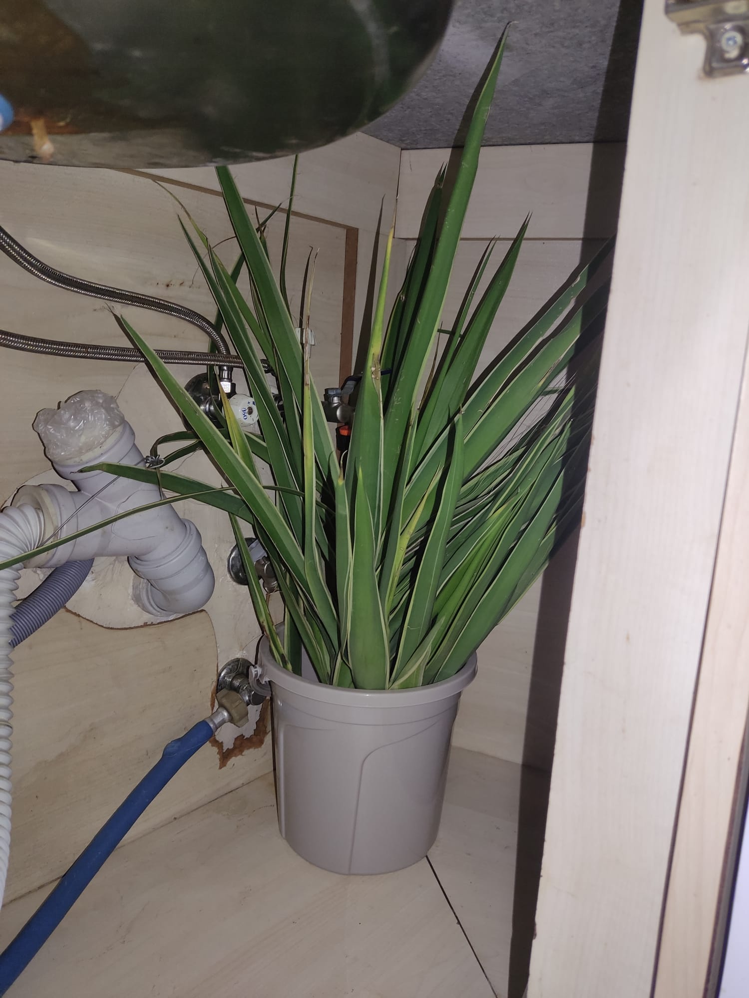 Esta yucca variegata la he metido debajo del fregadero, la tenía en la oficina pero hace mucho calor ahi, creo que debe estar en un lugar mas frio a ver si me aguanta bien hasta marzo y son las primeras que planto. Bueno según se comporte actuaré.