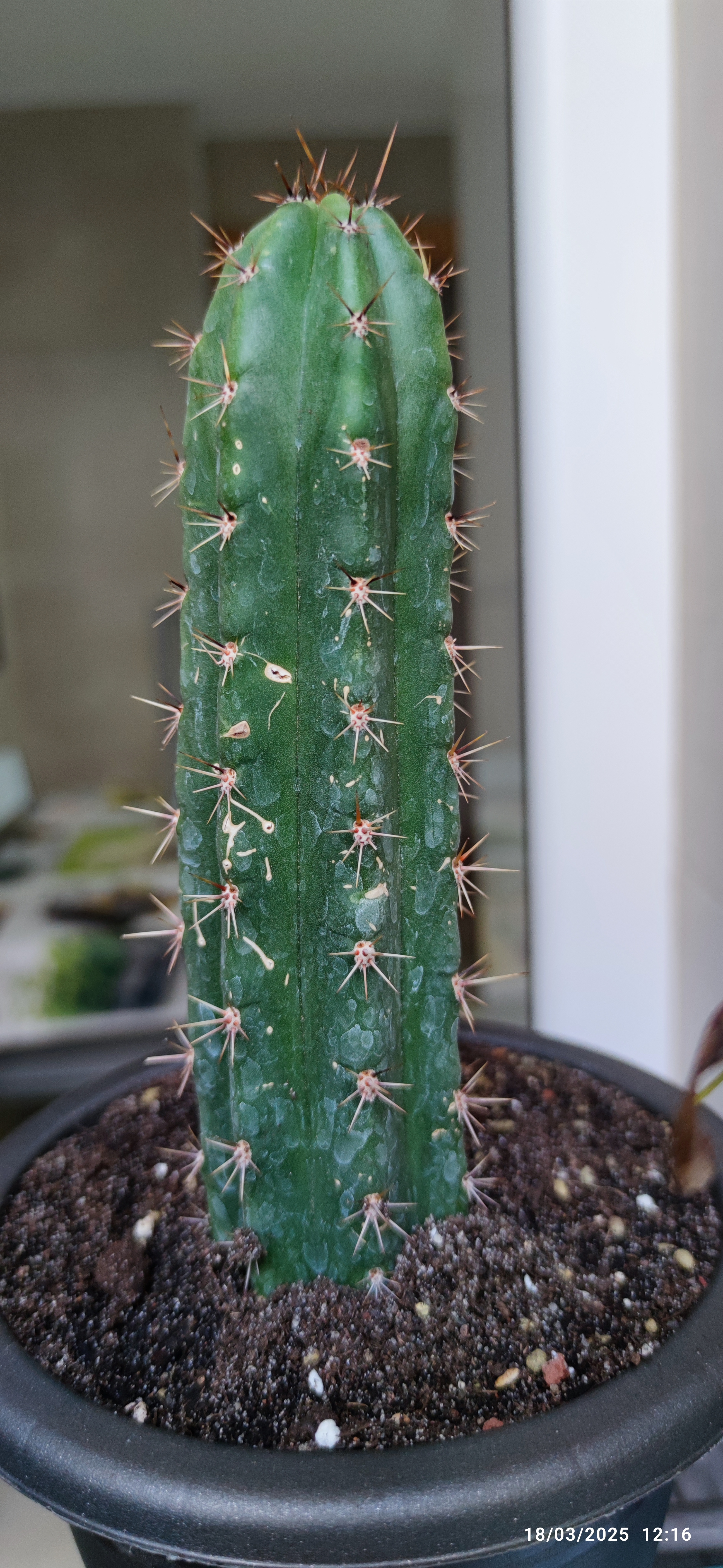 En cuanto a que sea algún Cereus es algo totalmente descartado, la forma de las costillas es inversa, si te fijas el Echinopsis pachanoi es un polígono algo redondeado y los Cereus son una estrella algo redondeada. Es un carácter fijo, no cambia desde que la planta tiene pocos centímetros hasta adulta.