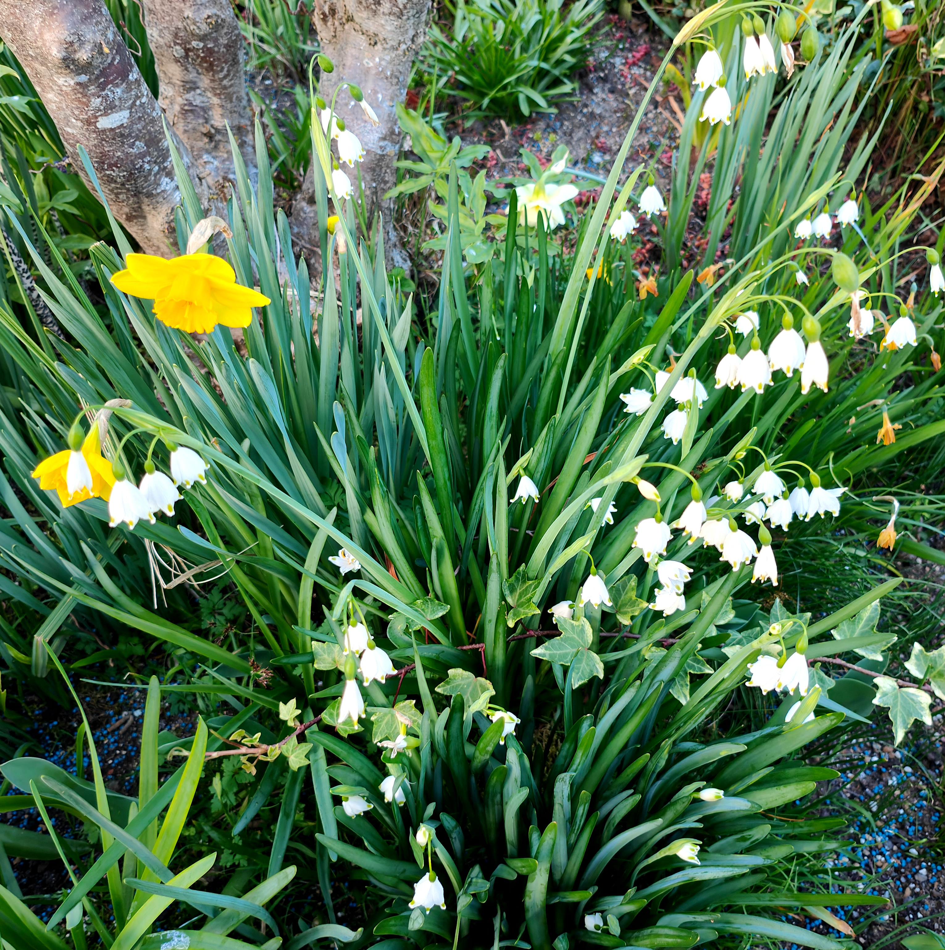 Narciso con Leucojum . Siempre me ha gustado el muguet pero lo intenté dos veces y no lo conseguí. En cambio el leucojum se adapta muy bien tengo cantidad , son unas campanillas blancas pequeñitas con un puntito verde en la punta de los pétalos
