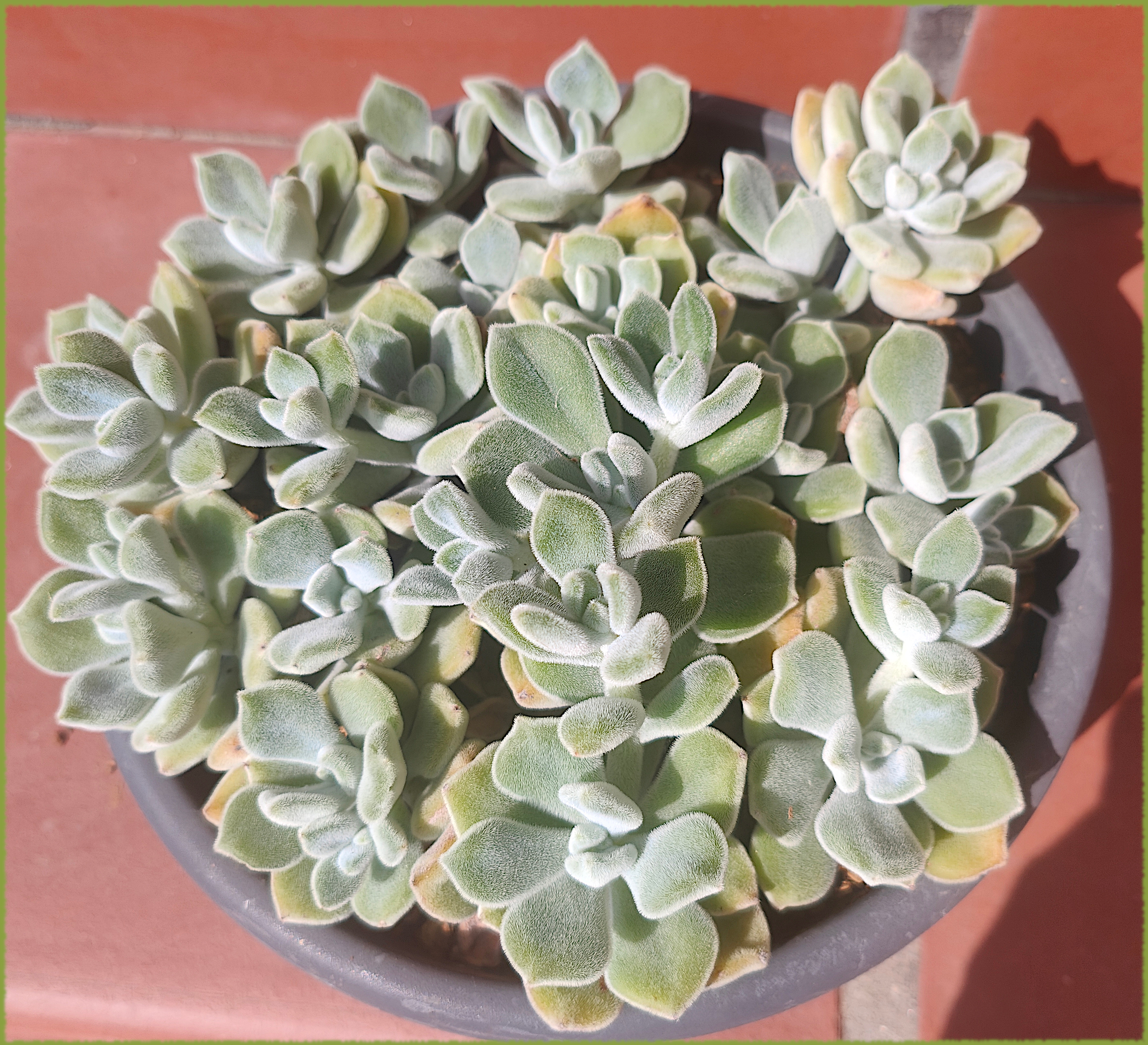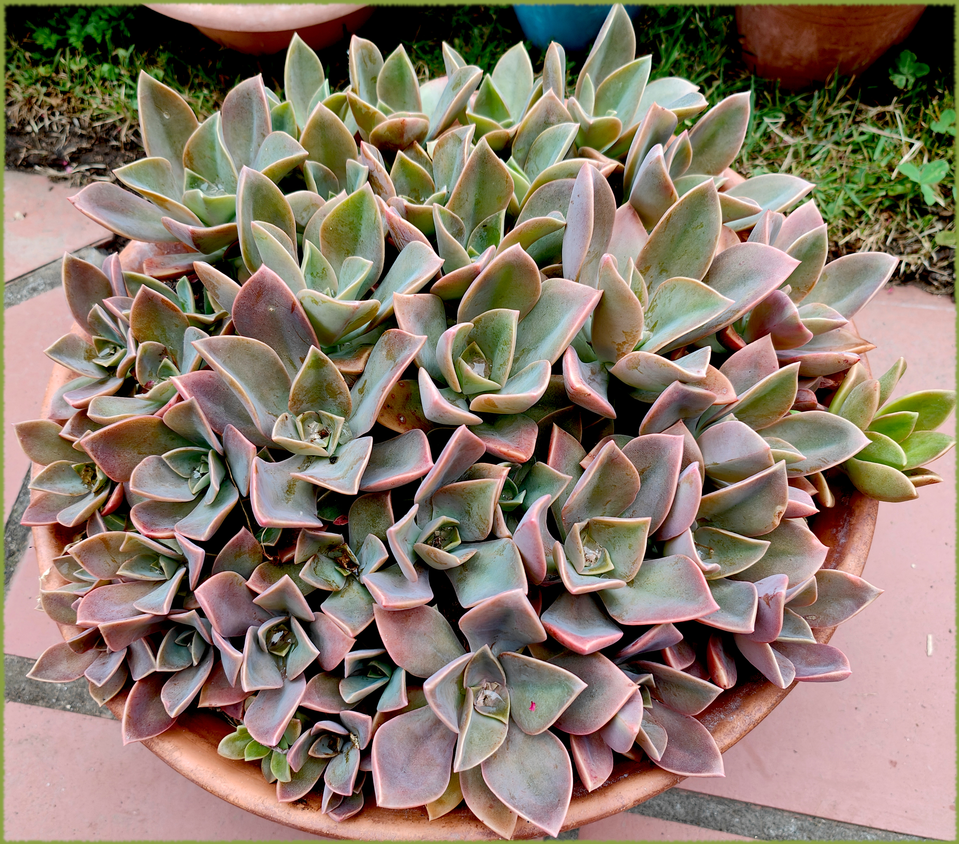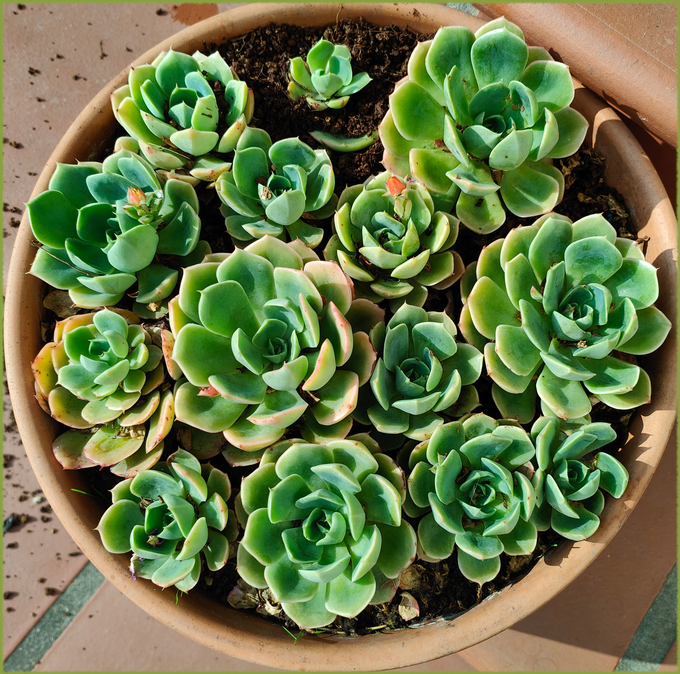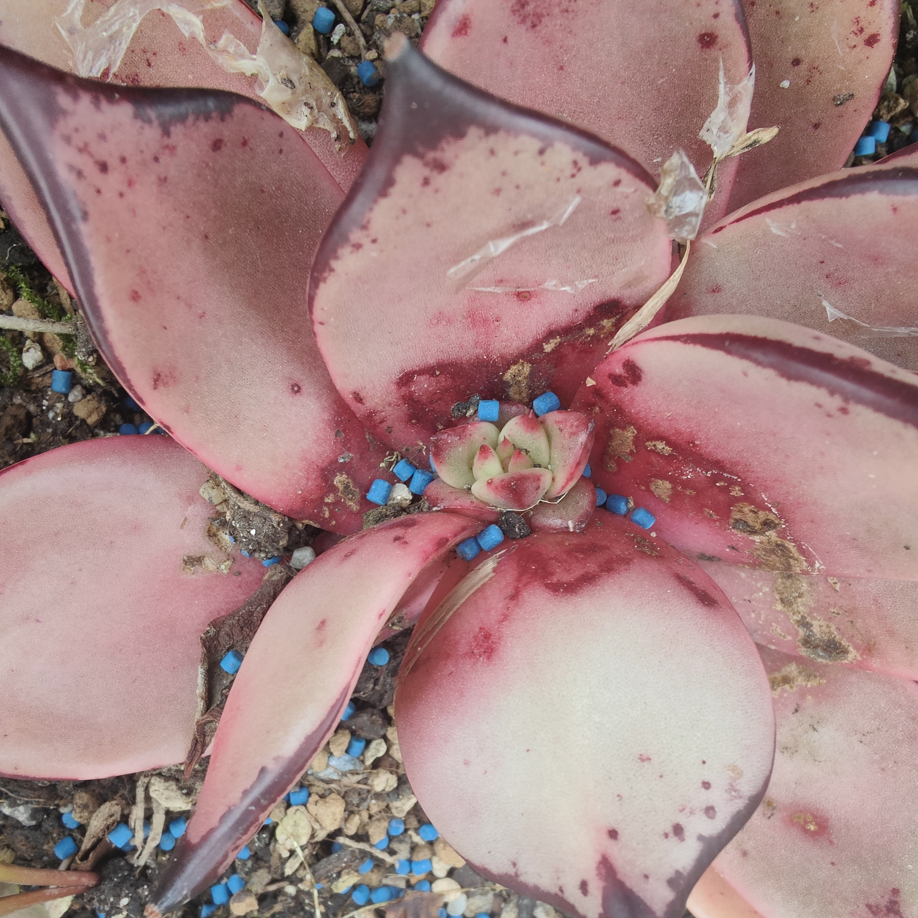 Antes de irme me cargué la echeveria agavoides Romeo al fumigarla con un producto muy fuerte. Coloqué en tierra los restos. La roseta sigue siendo media roseta pero ha decidido perpetuarse. Las bolitas azules son caracolicida. Con tanto verde y tanta humedad, aquí lo lógico sería poner una granja de caracoles.
