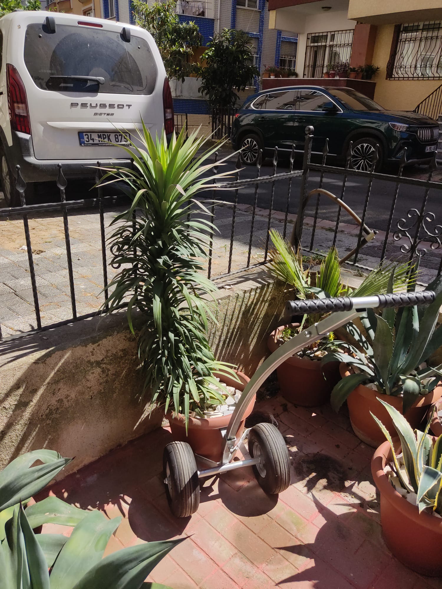 Esas fotos se corresponden con lo siguiente: la primera es la posición que lleva teniendo desde hace tres años que ya tiene riesgo de que le corten la cabeza desde la calle por cualquier descuido y entonces decidí ponerla en la posición de la segunda foto que es mas segura, la planta ya no se mantiene de pie por si sola, es un tipo de yuca rastrera entonces en adelante la verdad no se que haré con ella, no me gustaría para nada cortarla.