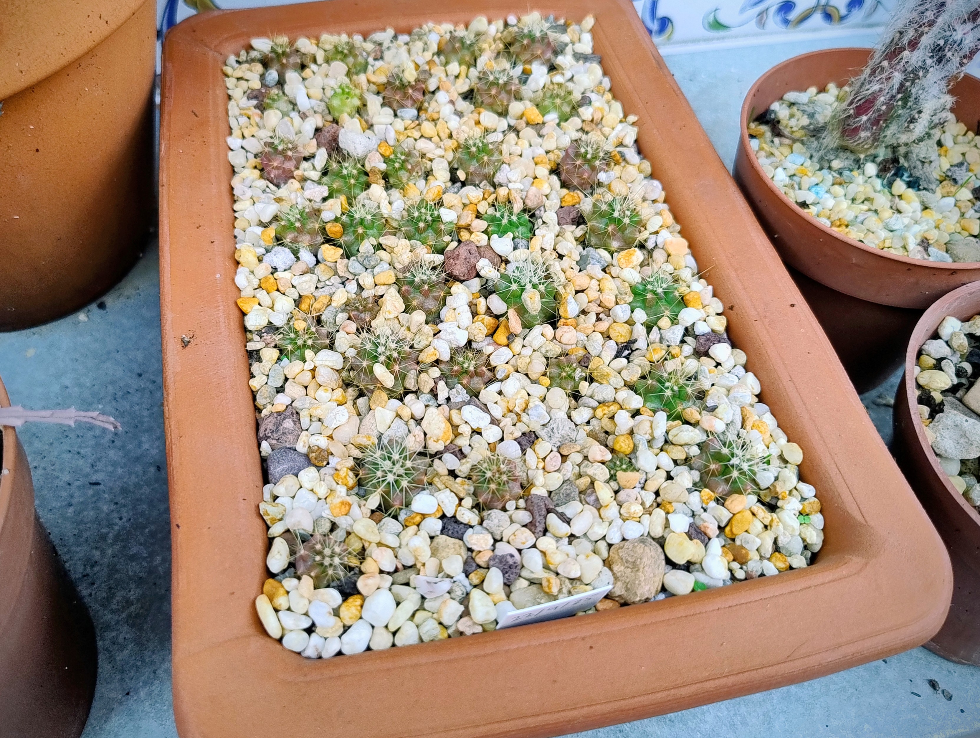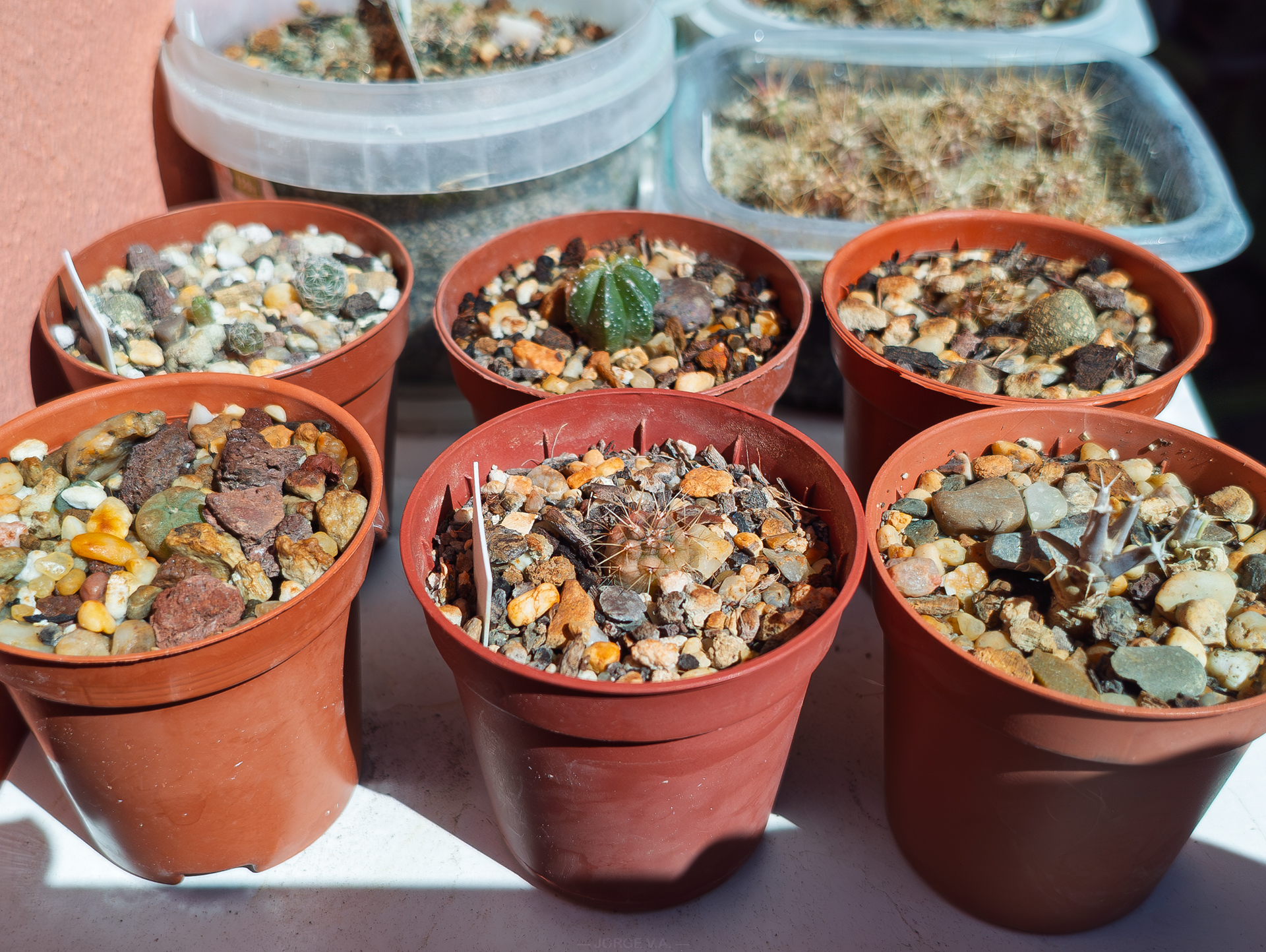 Los fui pasando a macetas pequeñas del 5'5cm... Empezando por arriba izquierda hay Turbinicarpus aff. saueri, Astrophytum ornatum, Thelocactus setispinus, Lophophora williamsii, Gymnocalycium baldianum y Leuchtenbergia principis.