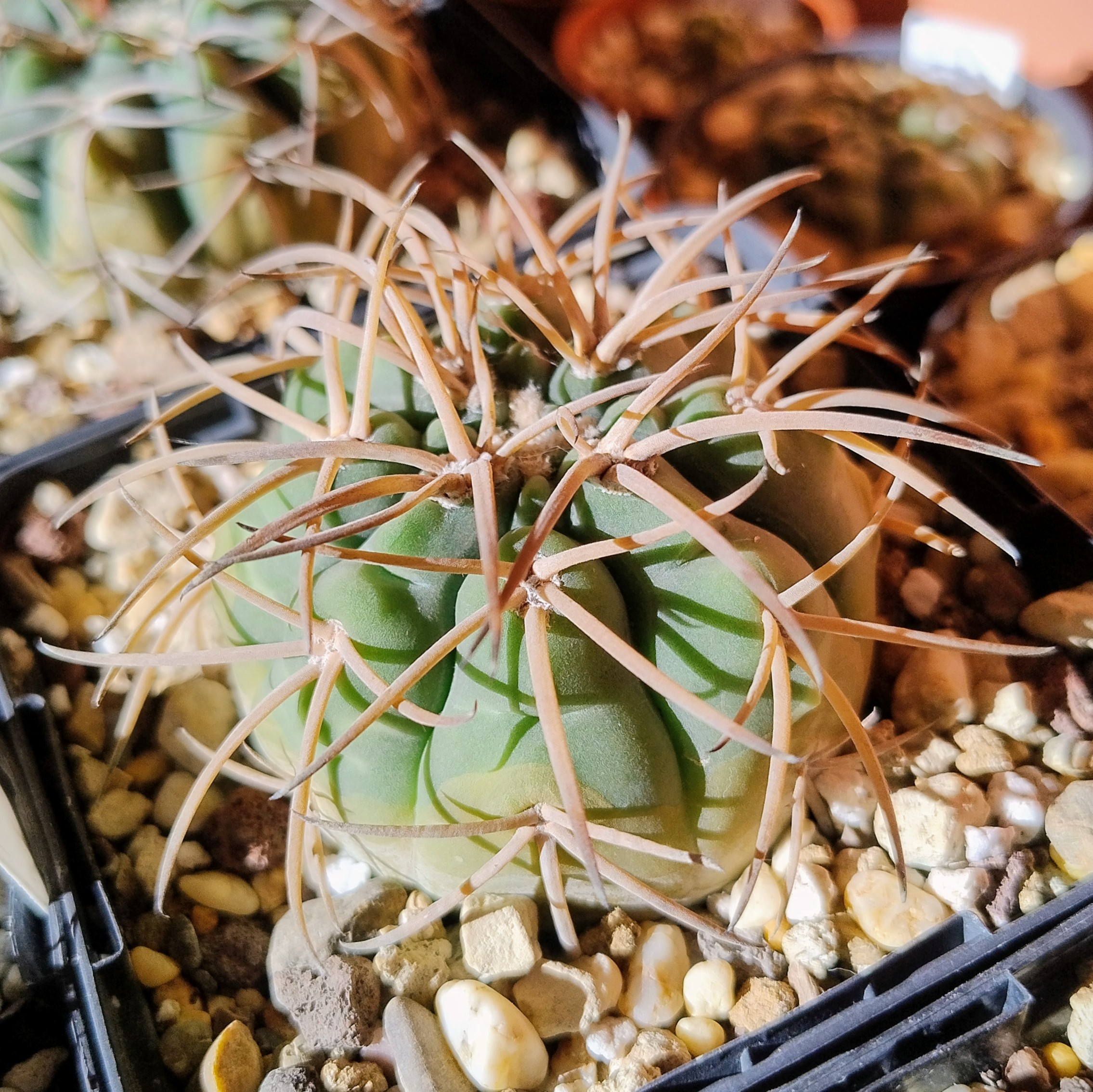 Como planta del día he elegido este Gymnocalycium spegazzinii, que si bien no florece aún, lo compensa con una bonita espinación.
