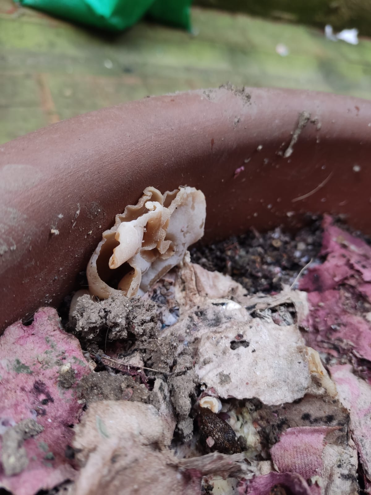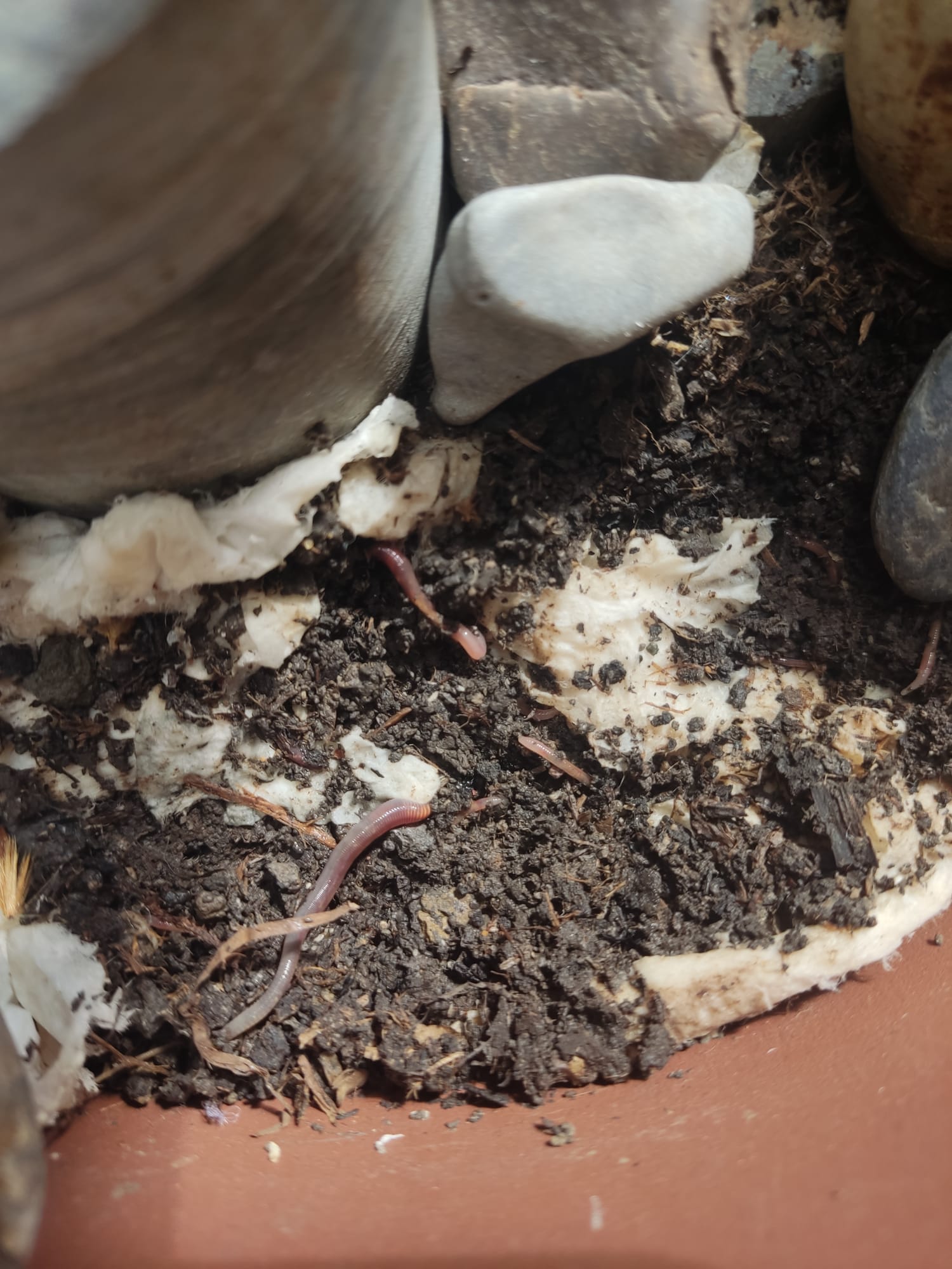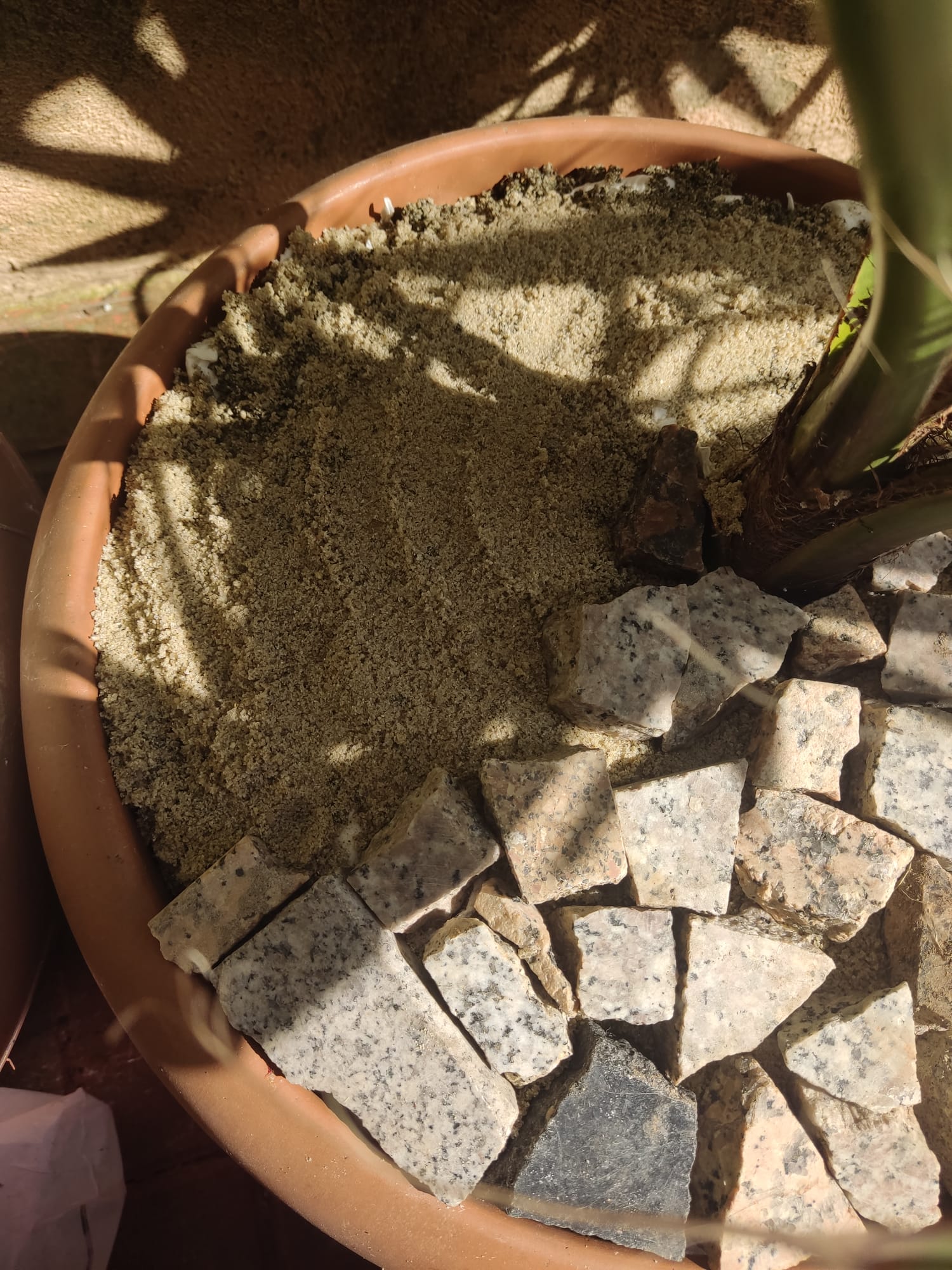 Se veía una cantidad enorme de restos ya eliminados pero no hice foto, solamente unas cáscaras de granada que parece que son mas duras pero de antes que le puse las cáscaras de cacahuete no quedaba nada de eso, se va super rápido. Esta vez le puse de todo un poco mezclado por encima y las piedras, a ver que pasa. Si las lombrices consiguen pasar por medio de la arena (que no lo se), si ya lo se GPT dice que un cm de arena lo van a atravesar las lombrices sin problemas sobre todo porque notan huelen lo que le puse encima. Además que tardan 6 meses en homogeneizar todo hasta 20 cm de profundidad y unos 2 años hasta que toda la maceta tenga la tierra homogenea.