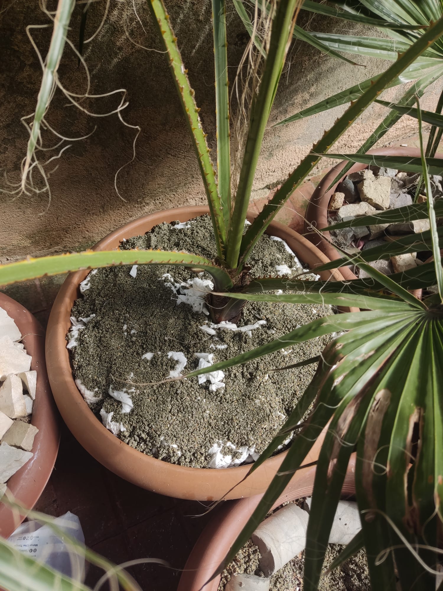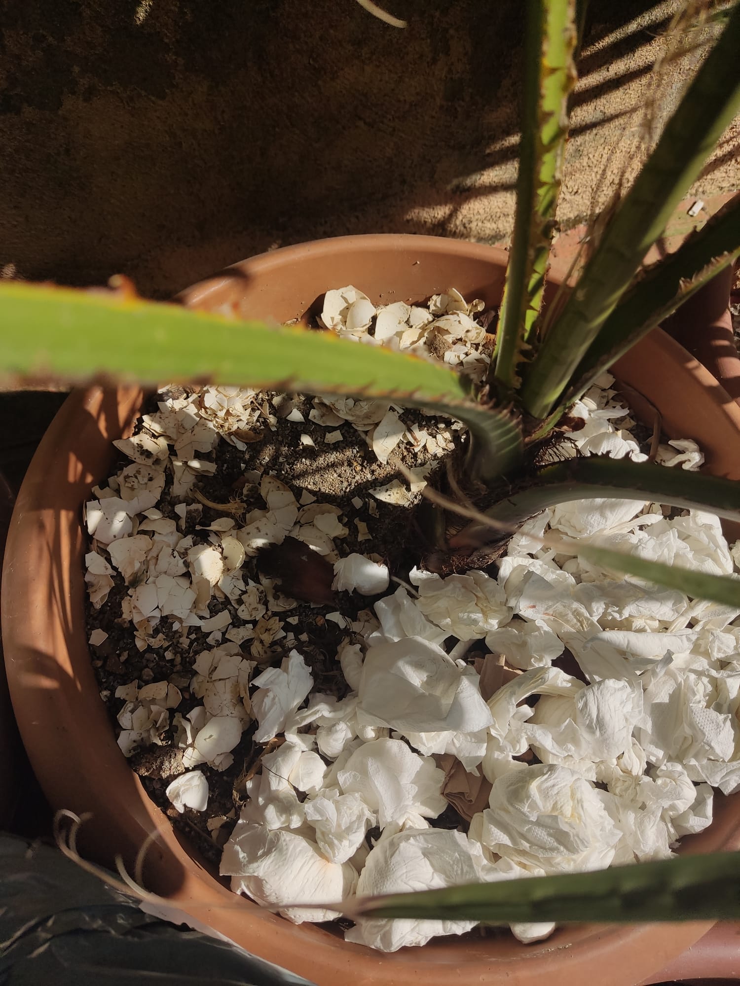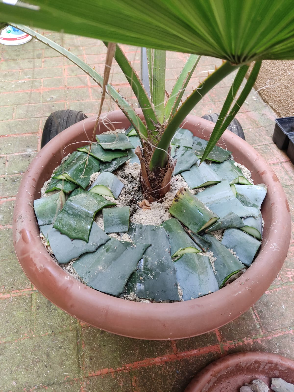 Esto en una de las palmeras grandes. Alguien habló de poner las cáscaras para caracoles y babosas.