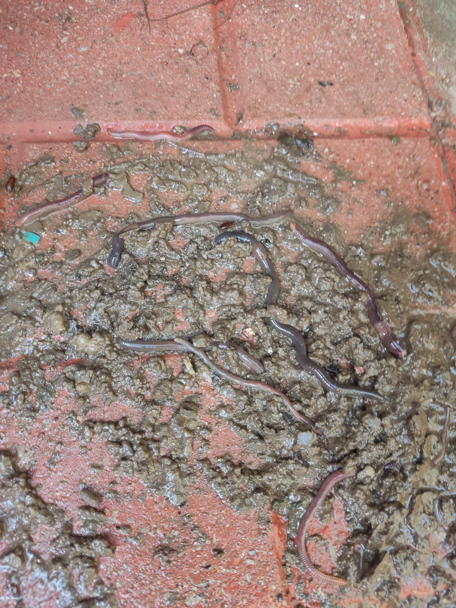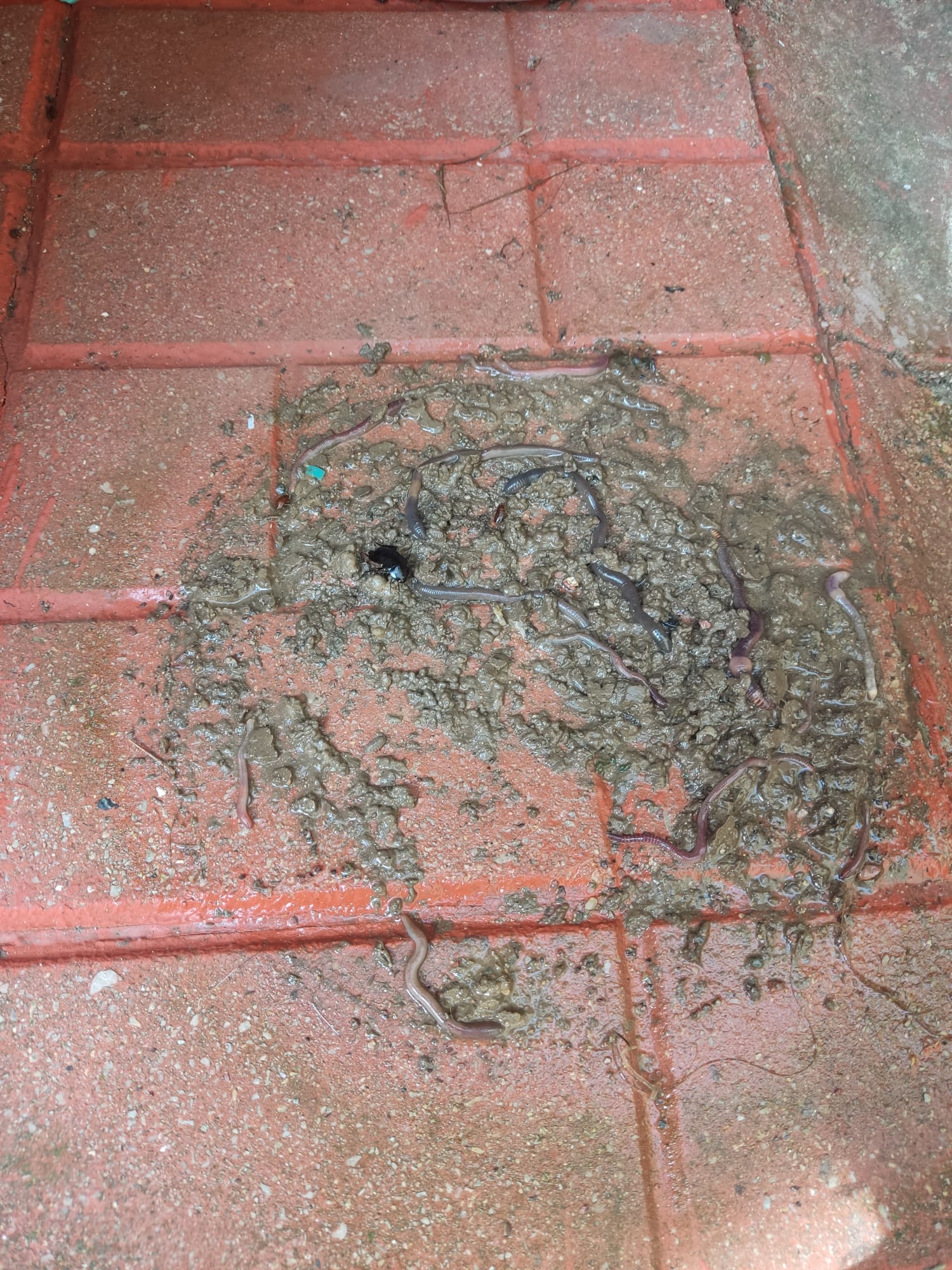 Por otro lado vi lombrices por los suelos haciendo cosas raras, se había taponado el desagüe de tanta lluvia y había un gran charco, y había lombrices pequeñas bailando en el agua, no se si estaban ahogándose muriendose o que parecia que simplemente estaban bailando? jugando? las saqué y la puse en una maceta sin mas