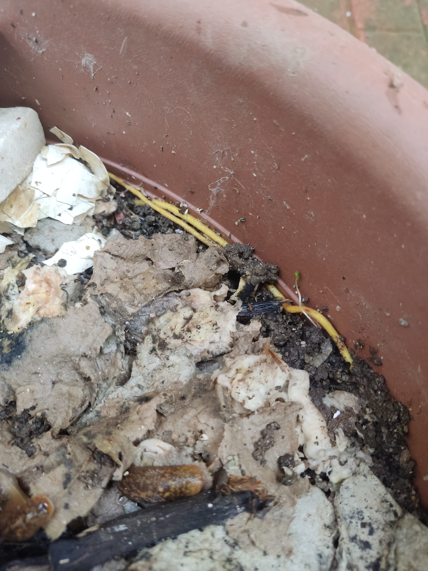 Bueno tenemos las raices que están circunvalando ya la maceta. Eso es que la planta está dominando el terreno bien.... La verdad para una planta tan pequeña me sorprendió pero bueno... quizás toda la basura y cosas extrañas que le tiro están sirviendo de algo.