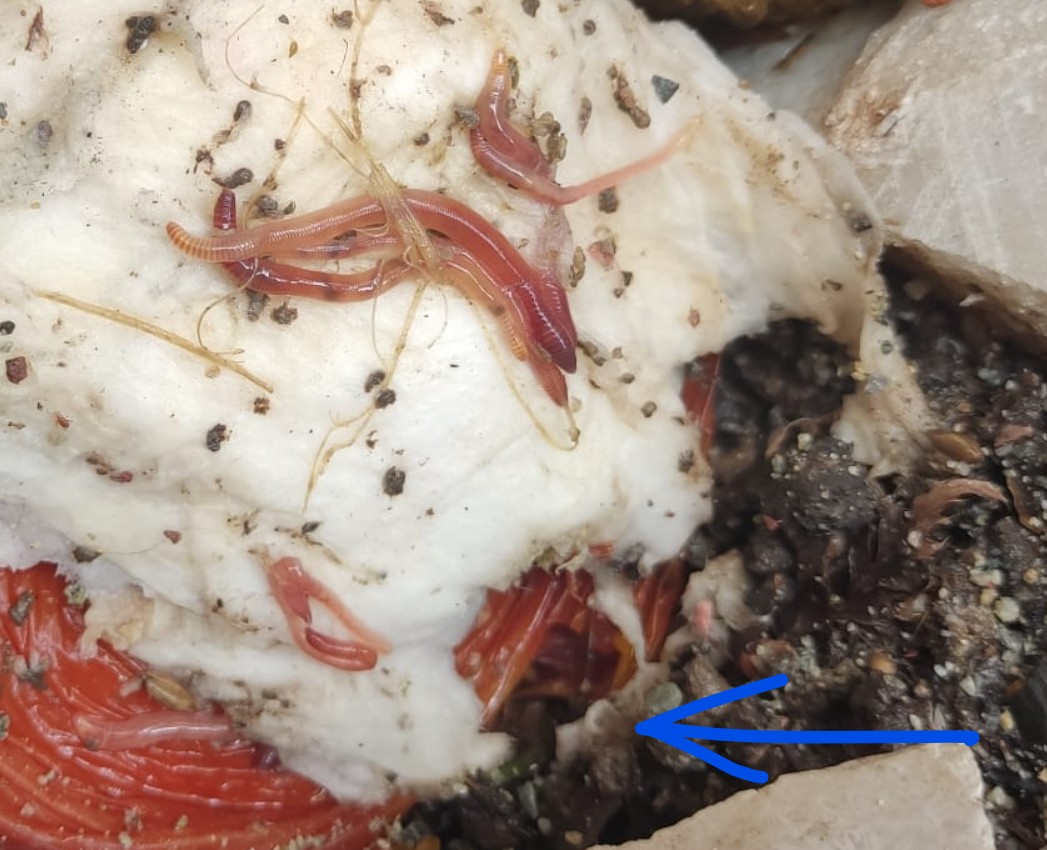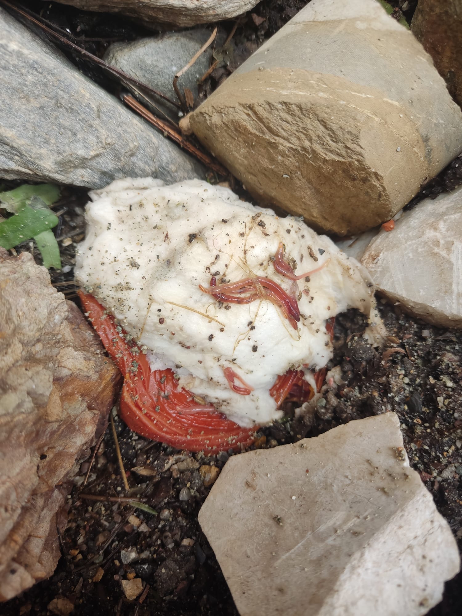 Ahí donde está la flecha azul es donde estaba comiendo, lo de arriba no se si es la misma lombriz u otra de igual calibre, no llegué a verlo, pero se está comiendo como medio sándwich de tomate podrido con papel higiénico.