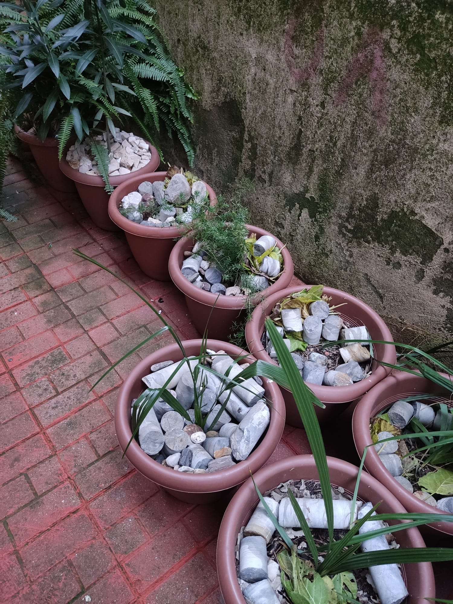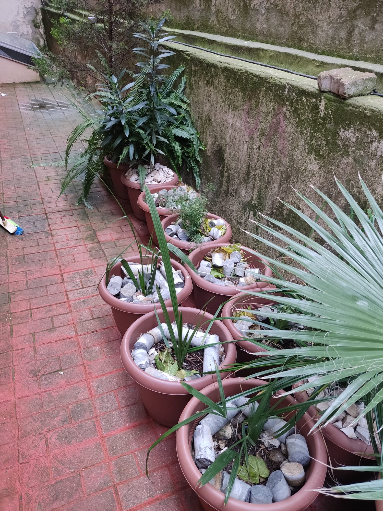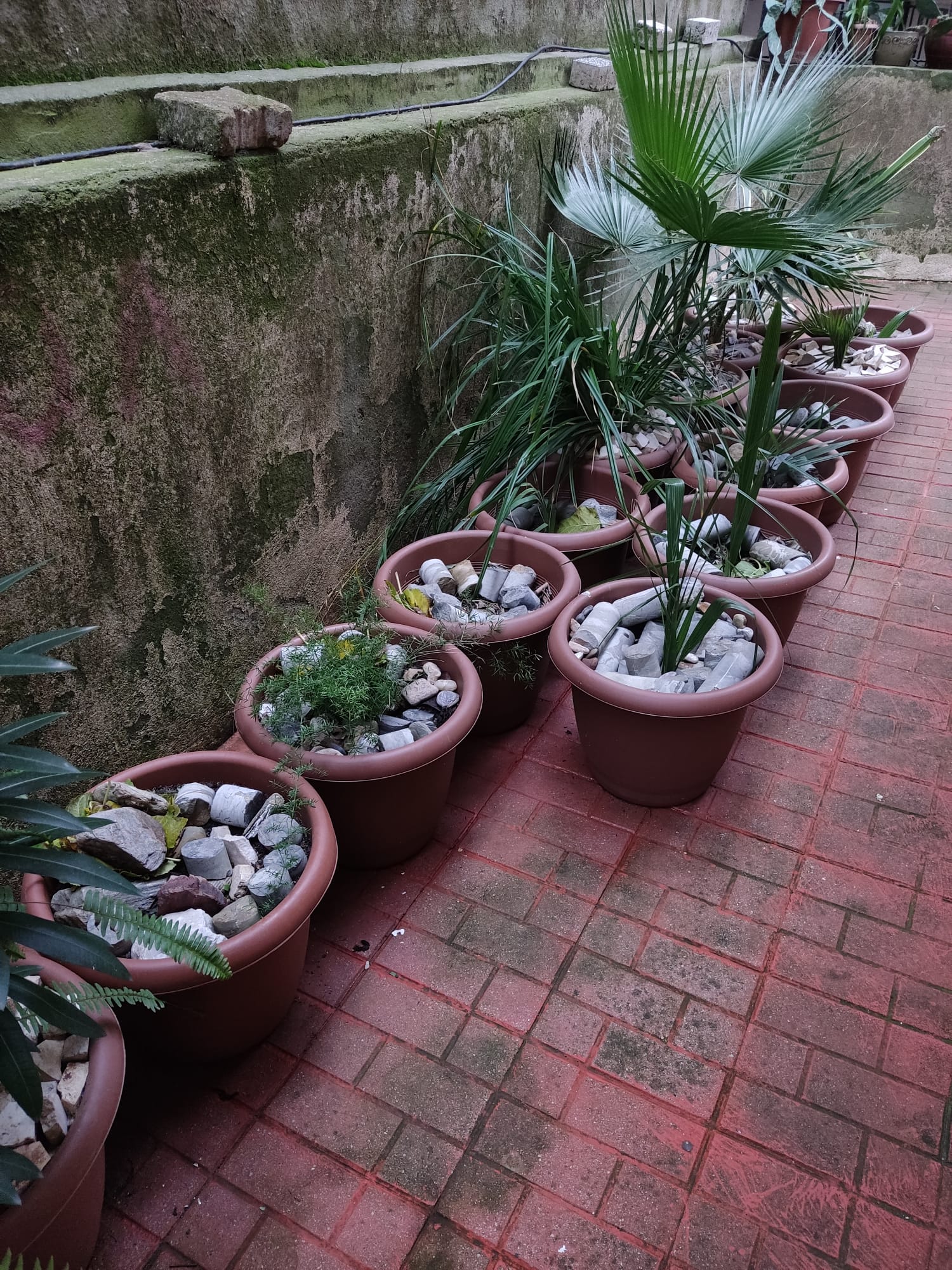 Esta foto es muy parecida a una de las anteriores pero con mas detalle para explicar lo siguiente: Al fondo se ve el helecho y la adelfa, justo al lado de la adelfa puse un helecho salvaje autóctono que murió, no se si voy a recuperar esa planta creo que puede vivir conmigo pero será dentro de bastantes años porque estoy saturado de plantas y no puedo encargarme de tantas, de hecho creo que voy a devolver al bosque un helecho y una especie de planta cercana a los espárragos salvajes, no van bien en mi jardín y prefiero que no se mueran. El otro helecho si creo que puede vivir bien lo que pasa es que un gato callejero hizo las cosas mal. Por ahora nada de todos modos, estoy saturado de plantas. Esa maceta vacía voy a usarla para un lirio que se que tiene una flor marron amarilla rara y lo voy a poner en posición relativa donde está la maceta en la foto en la esquina abajo derecha, justo la que está justo arriba suya es otro lirio que no se que color tendrá porque lo vi tirado en la calle abandonado y no pude soportarlo y me lo llevé a casa, espero que sea de color azul y así tengo los dos colores mas comunes en esta zona. La graminea o cesped grande entonces irá a donde estaba la maceta vacía y la palmerita bebé irá a donde estaba la graminea, de esa manera estamos ganando un retranqueo de una maceta mas porque en todo el medio se ve la esparraguera, y abajo a la derecha de esta hay otra esparraguera mas pequeña, esa la voy a poner en el lado que está vacio junto a la esparraguera grande, de esta manera ese hueco permite un retranqueo de todo en esa dirección y por eso digo máximo 16 o 17 nuevas macetas en la esquina debido a ese cambio. Parece que están aguantando bien el invierno en esa zona algo umbria. Luego para completar hasta el fondo podría poner cuatro macetas mas hasta poner junto a la tuya, creo que en el futuro esas cuatro macetas pueden ser dos tipos de helechos salvajes y dos tipos de plantas cercanas a las esparragueras que tienen las hojas muy verdes y echan frutos rojos por el centro de la hoja, bueno voy a dejar de describirlas, son estas dos las plantas que quiero tener pero se me está resistiendo, y voy a devolver una al bosque por ahora porque no consegui que prosperara ni tampoco conseguí sacarla de semillas, es super abundante en el bosque, ya veré pasados unos años