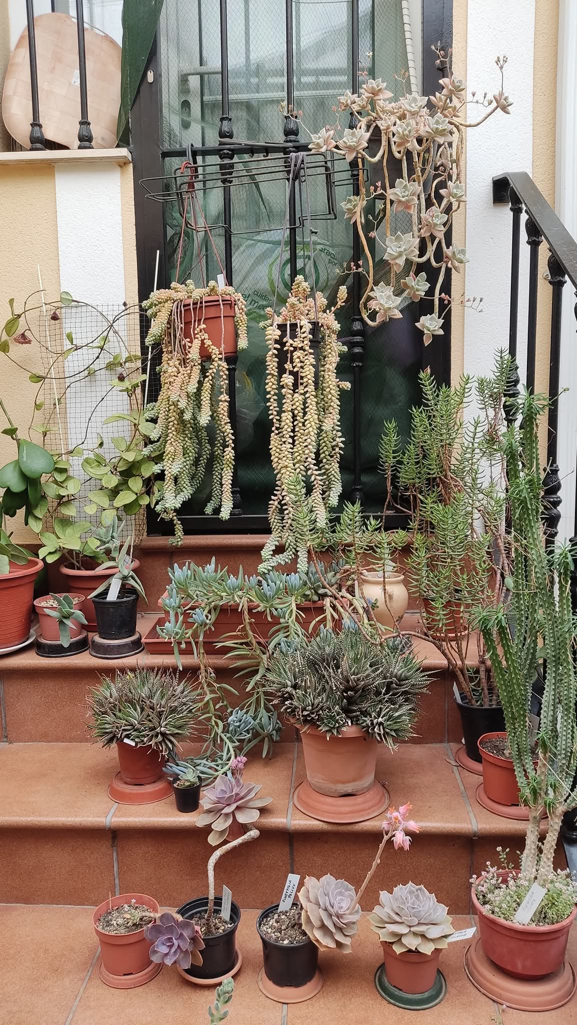 Lo que no he hecho todavía ni haré aqui es poner macetas mas pequeñas entre las macetas grandes, eso lo hice en Sevilla y fue un exito no se veían pero vivían super bien, aquí se podría hacer si los vecinos no existieran, pero se ponen tan tontos con tantas tonterias que mejor dejarlo como está además no tengo por que tener mas plantas está bien como está.