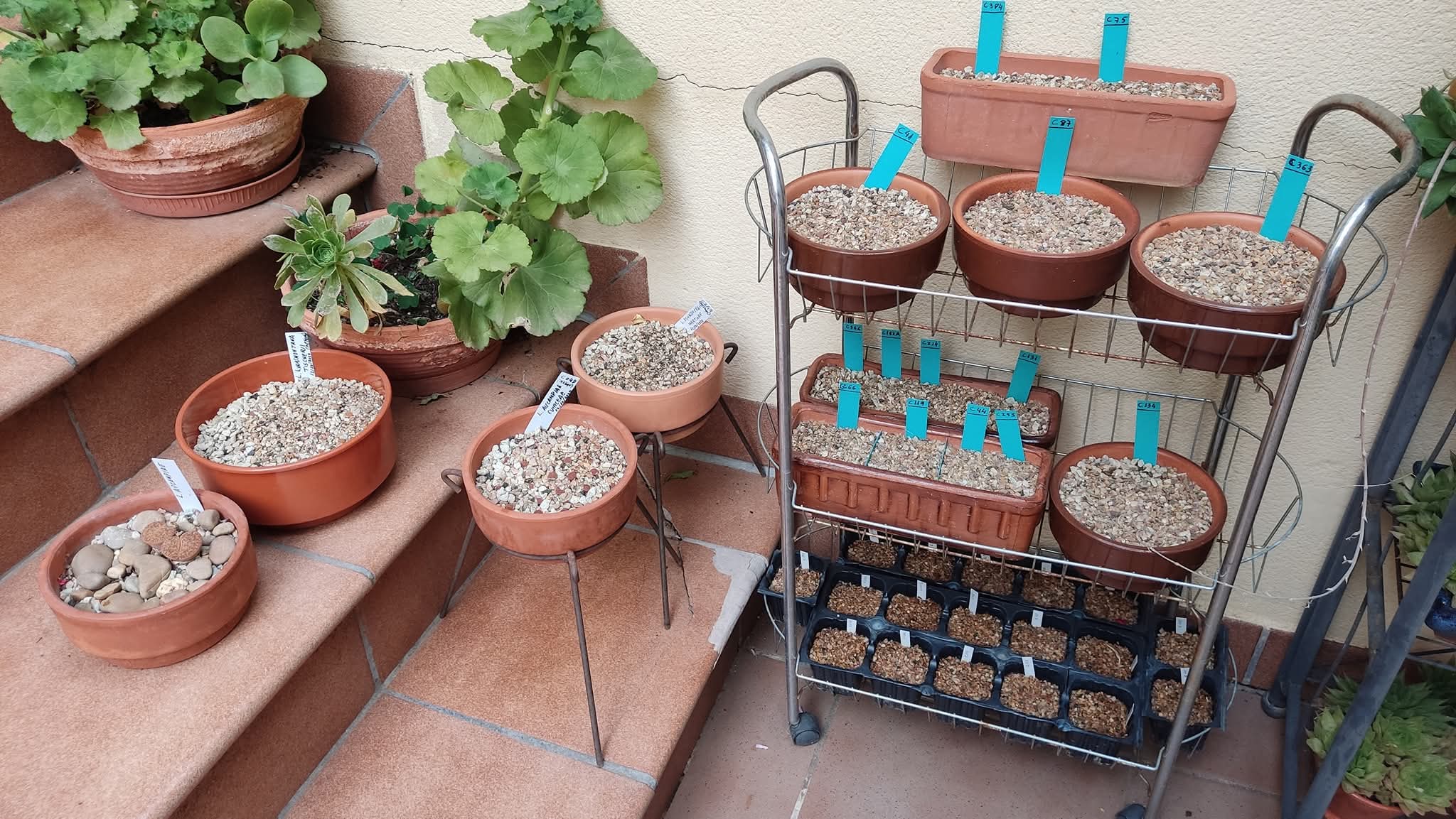 Mis macetas ahora están resguardadas de la lluvia, un poco apretujadas en estanterias-invernaderos y otras en el suelo en un mini invernadero túnel.