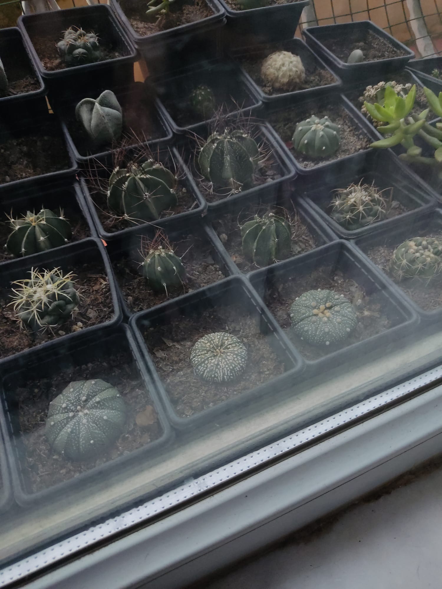 Así están los Astrophytum asterias y Astrophytum capricorne, pensaba meterlos en la oficina pero tantos lios, iban pasando los dias y los veía bien y pfff tengo todas las estanterias ocupadas blabla historias. No los he metido