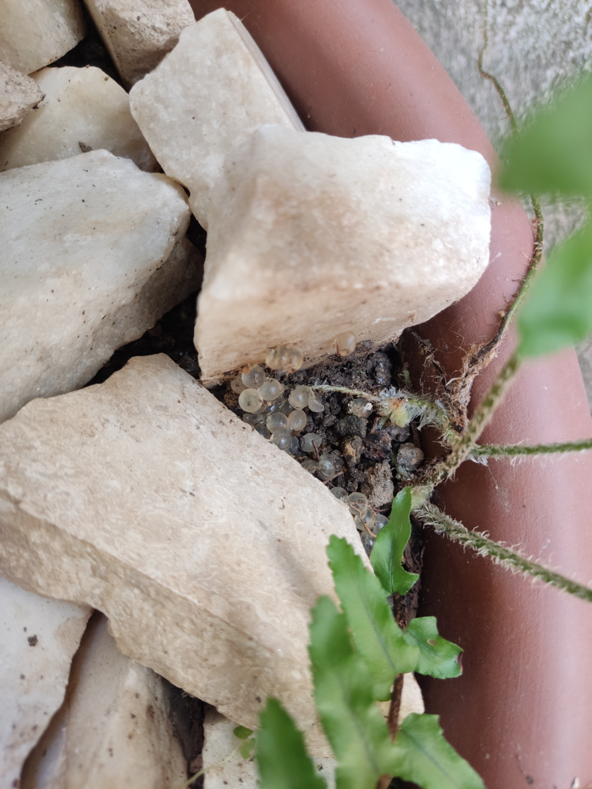 A esto se le podría llamar "bichos" entre comillas porque son huevos de caracol o de babosa que me encontré en una maceta y decidí dejarlos en paz.