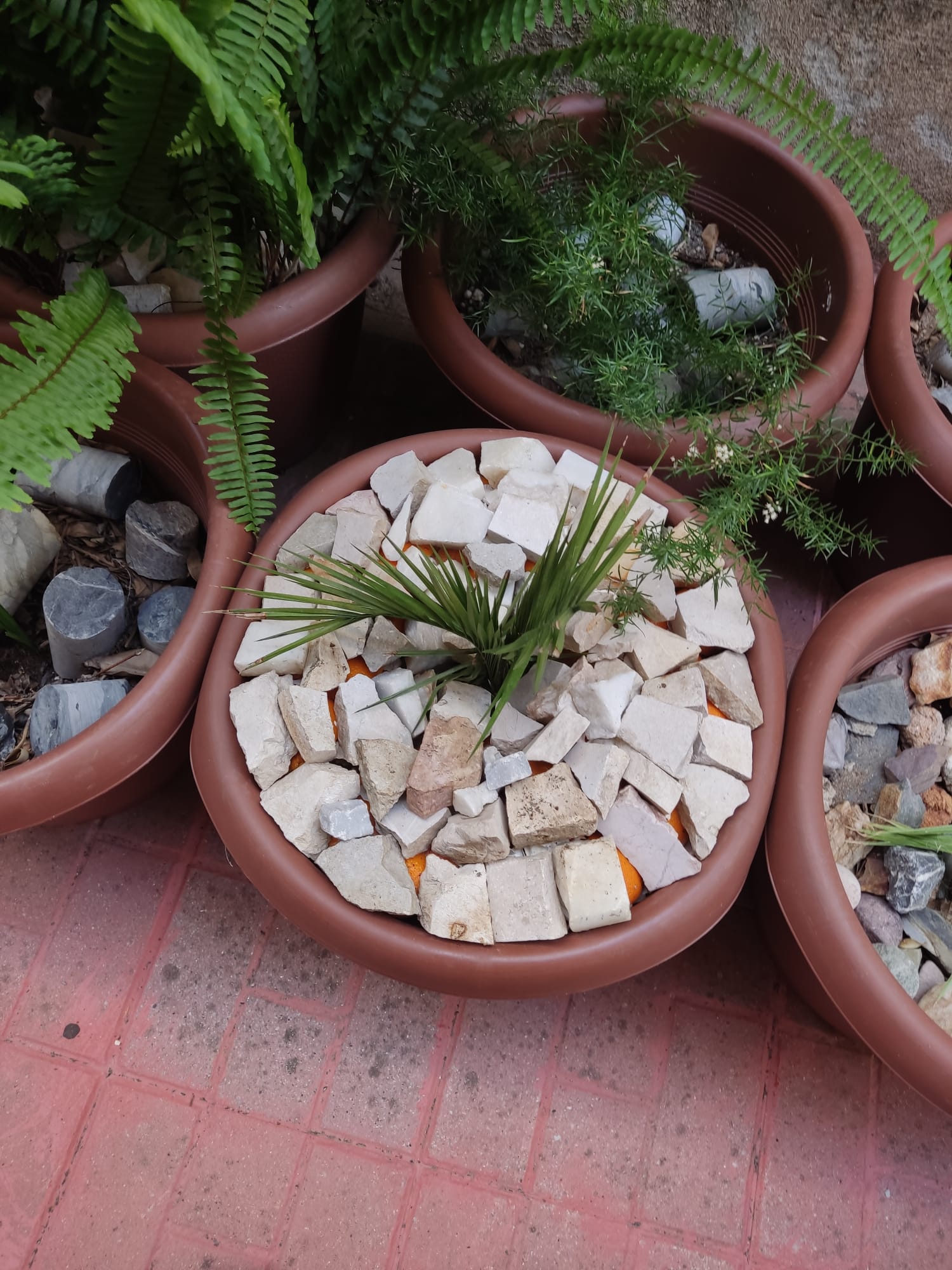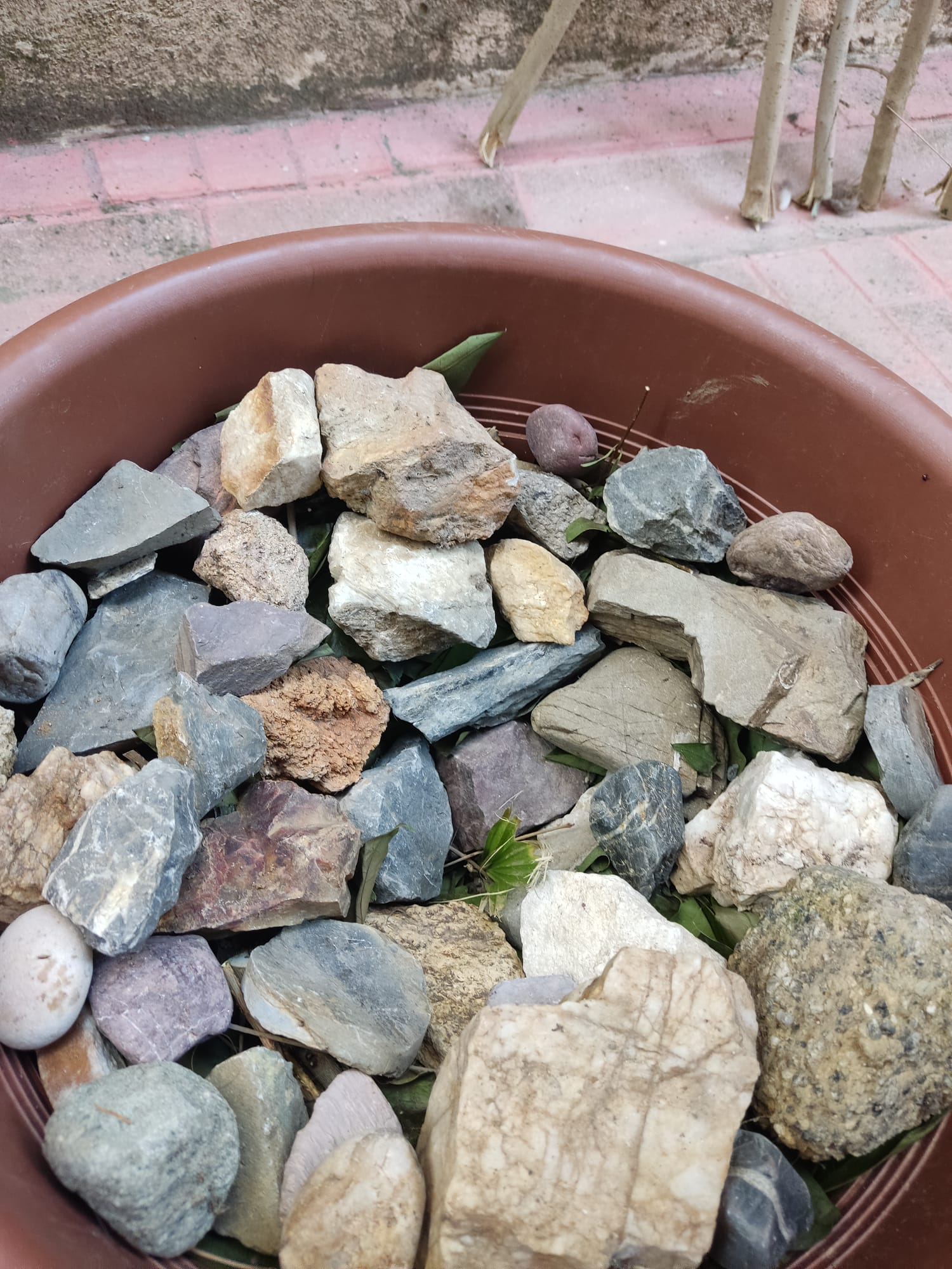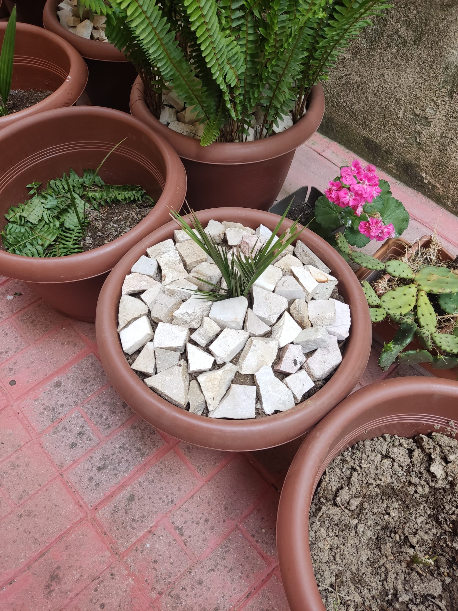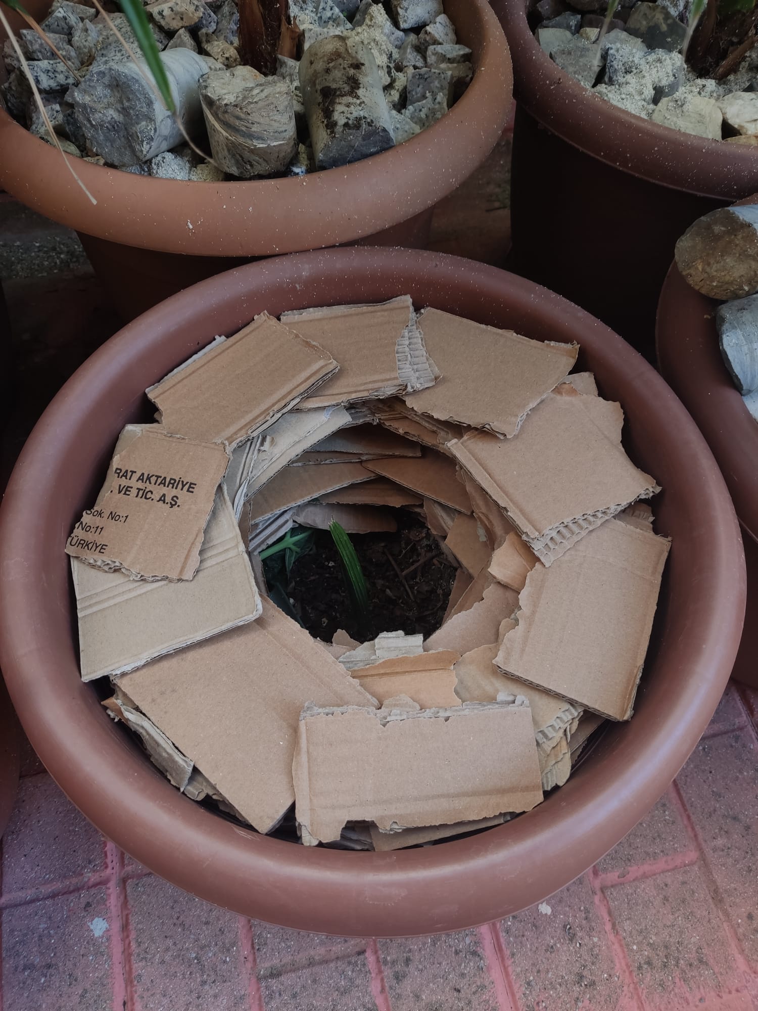 Una cosa que creo que voy a hacer es cortar los cartones de manera que "contengan o tapen" de manera optima, cualquier cosa que coloque debajo entonces visualmente solo se verá como mucho cartón por debajo de las piedras, con una simple capa de cartón ya tapas todo lo de debajo, incluso recortarlo para que entre la planta por en medio y el resto lo rellenas y tapas como una especie de circulo con un agujero en medio o sectores de circulo. O aunque sean pedazos irregulares se va tapando la superficie de esa manera y pones todo lo gordo debajo y te quedas tranquilo colocando las piedras encima.