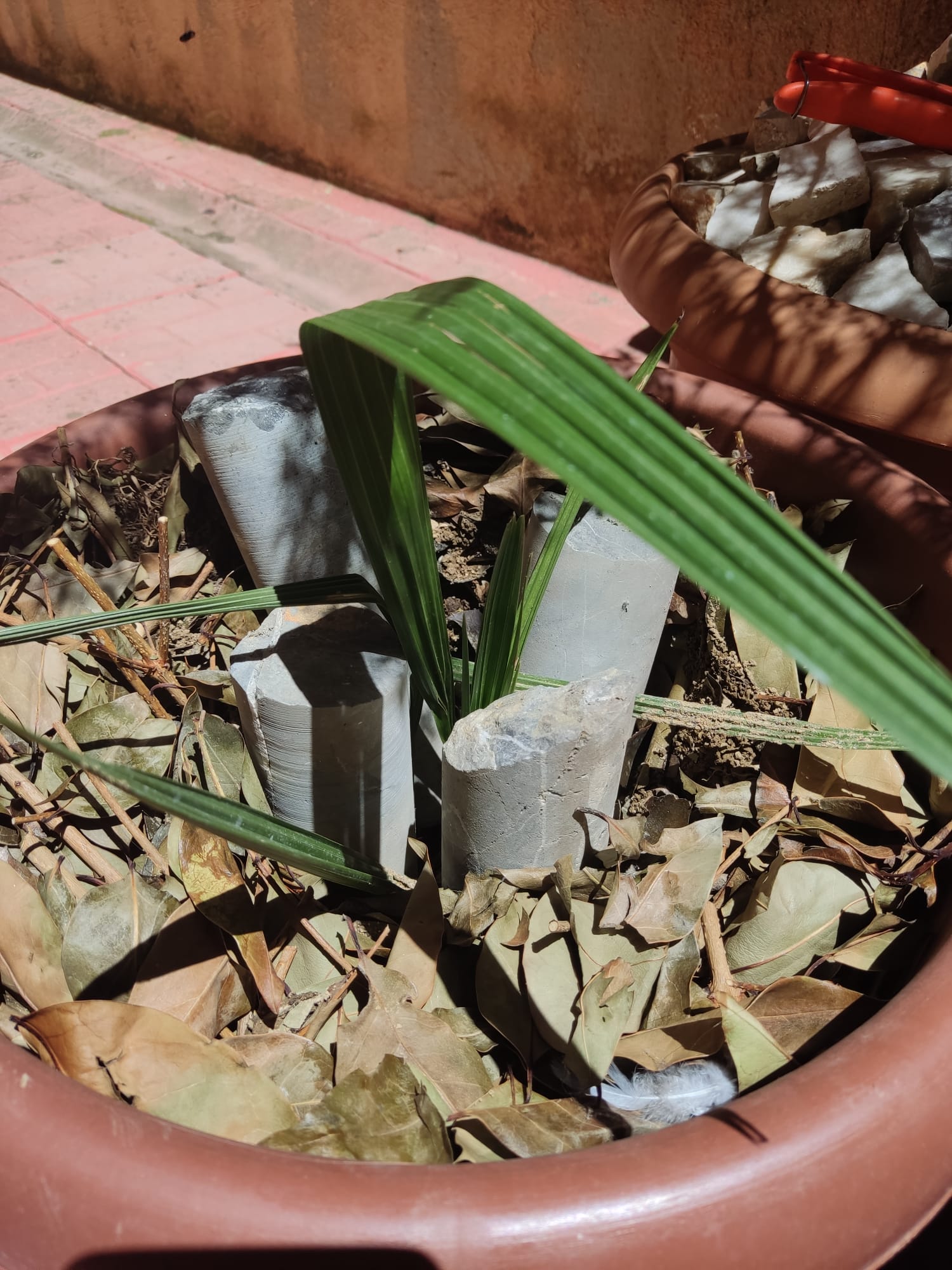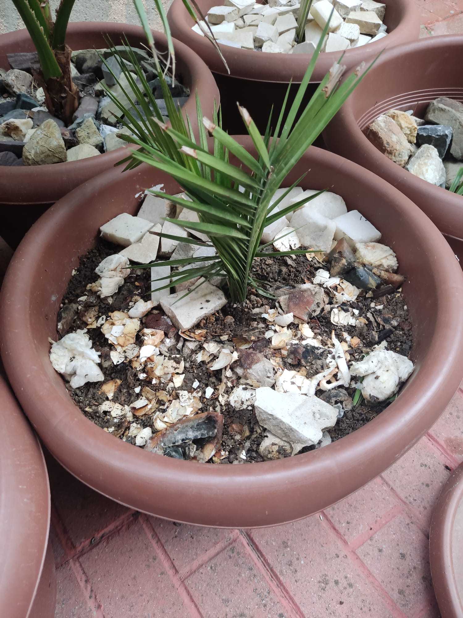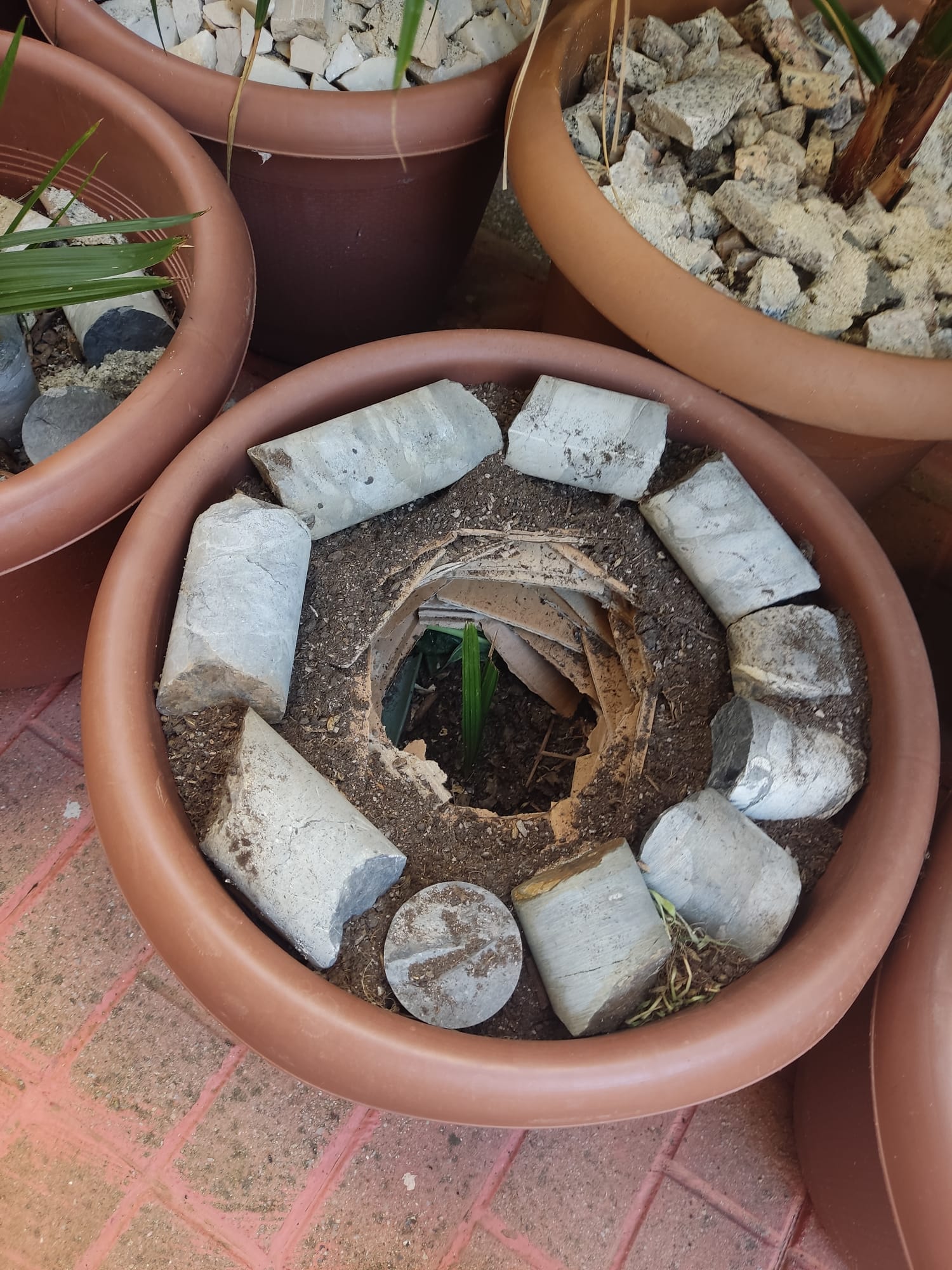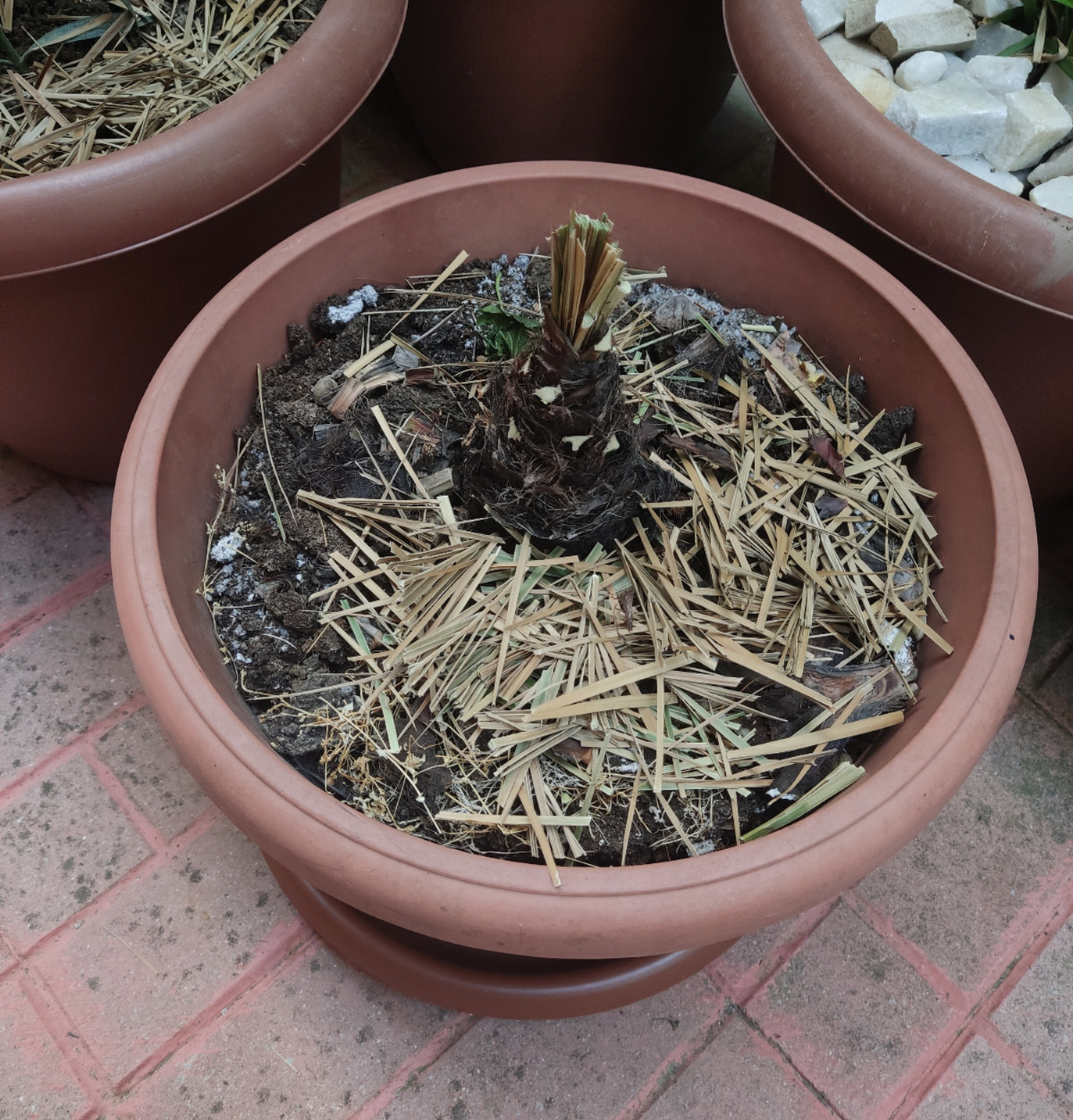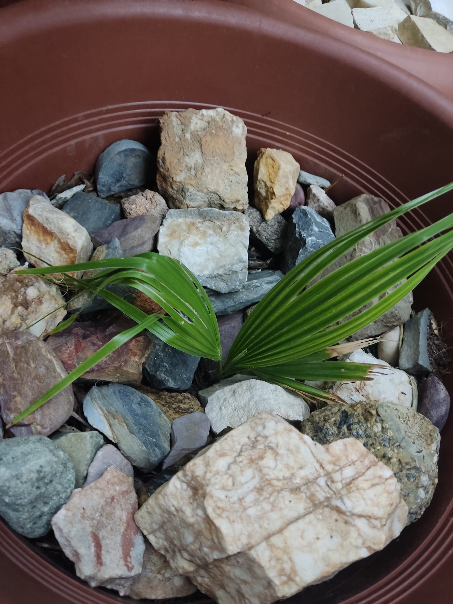 Una de las palmeras me di cuenta que le había sentado mal el transplante y le quité algo de tierra no debería estar tan enterrada al menos hasta que agarre y bueno aproveché para ponerle las hojas también y algunas piedras que le aguanten el agua, pues creo que no la voy a regar en bastante tiempo