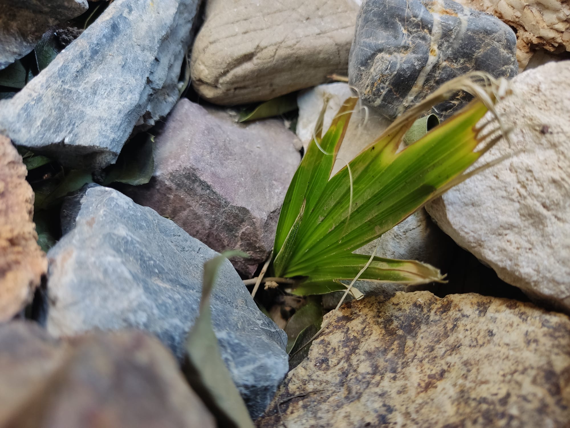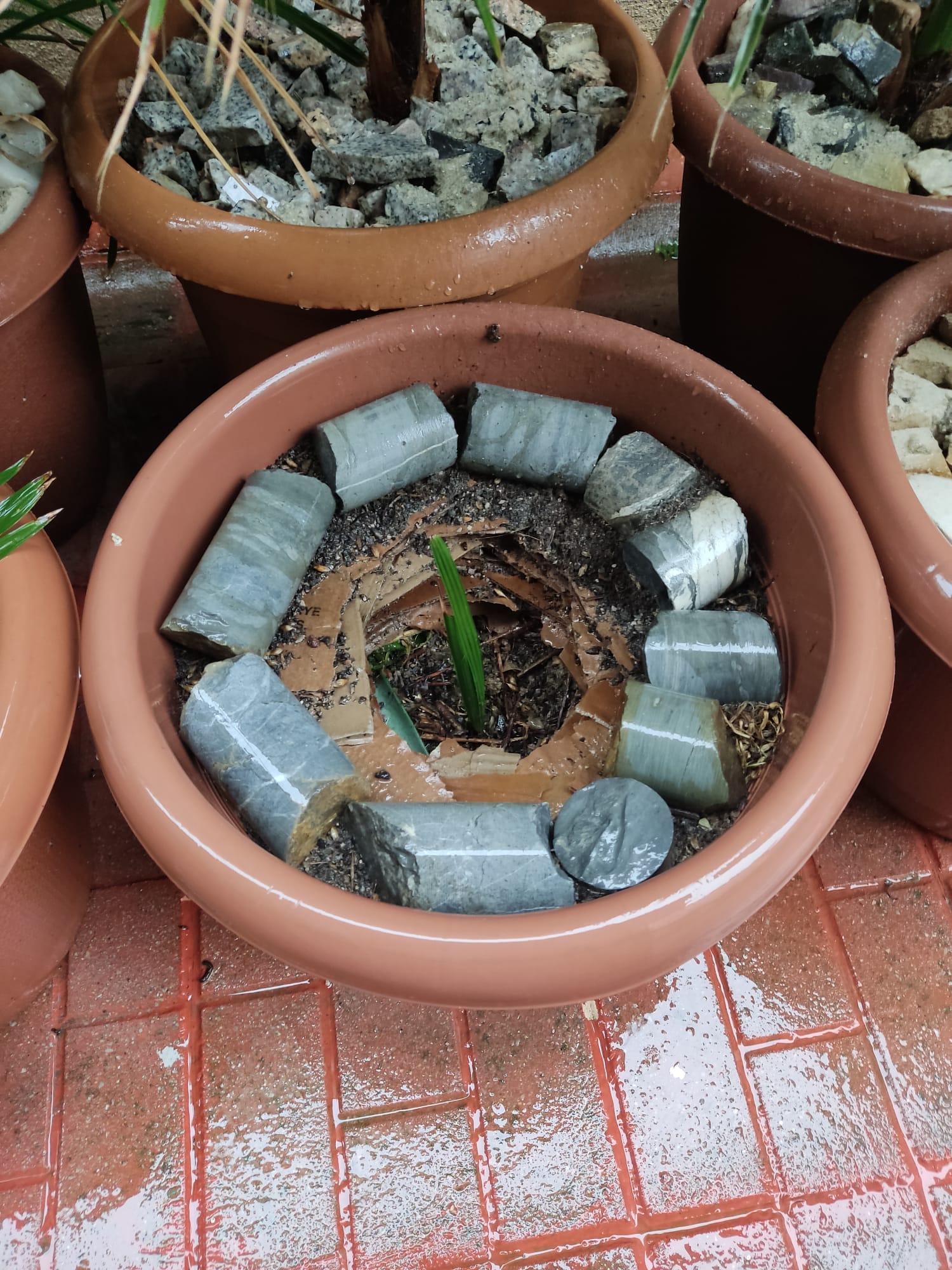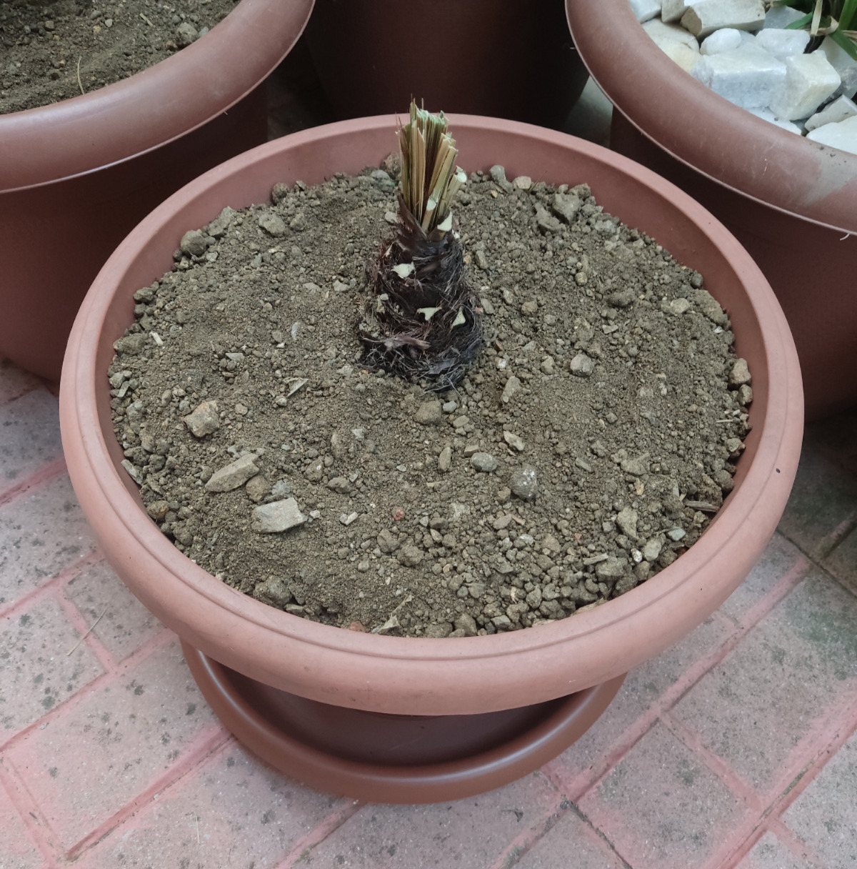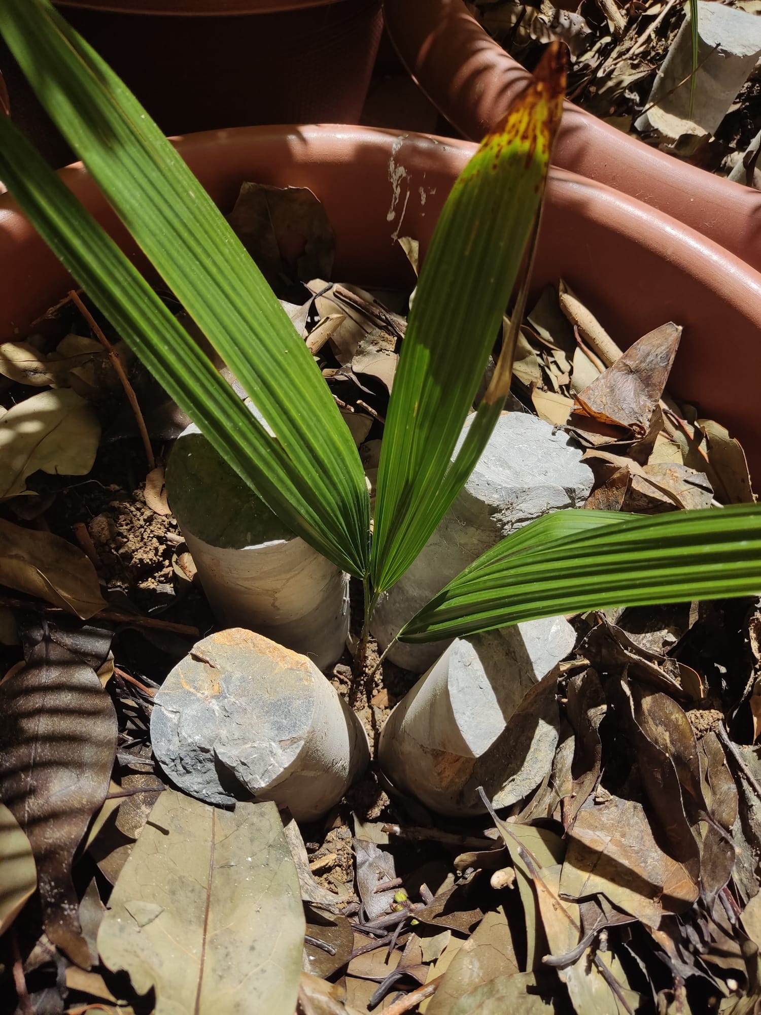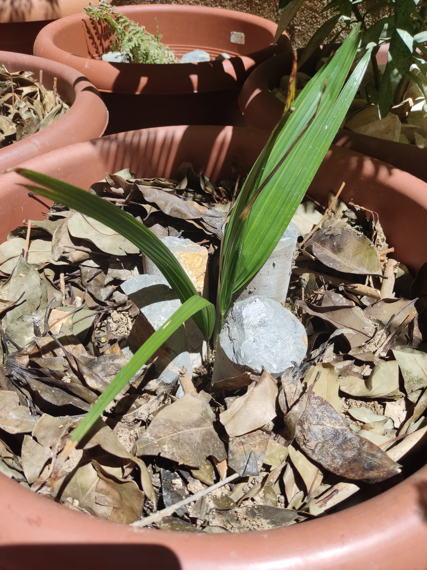 Una de las palmeras me di cuenta que le había sentado mal el transplante y le quité algo de tierra no debería estar tan enterrada al menos hasta que agarre y bueno aproveché para ponerle las hojas también y algunas piedras que le aguanten el agua, pues creo que no la voy a regar en bastante tiempo
