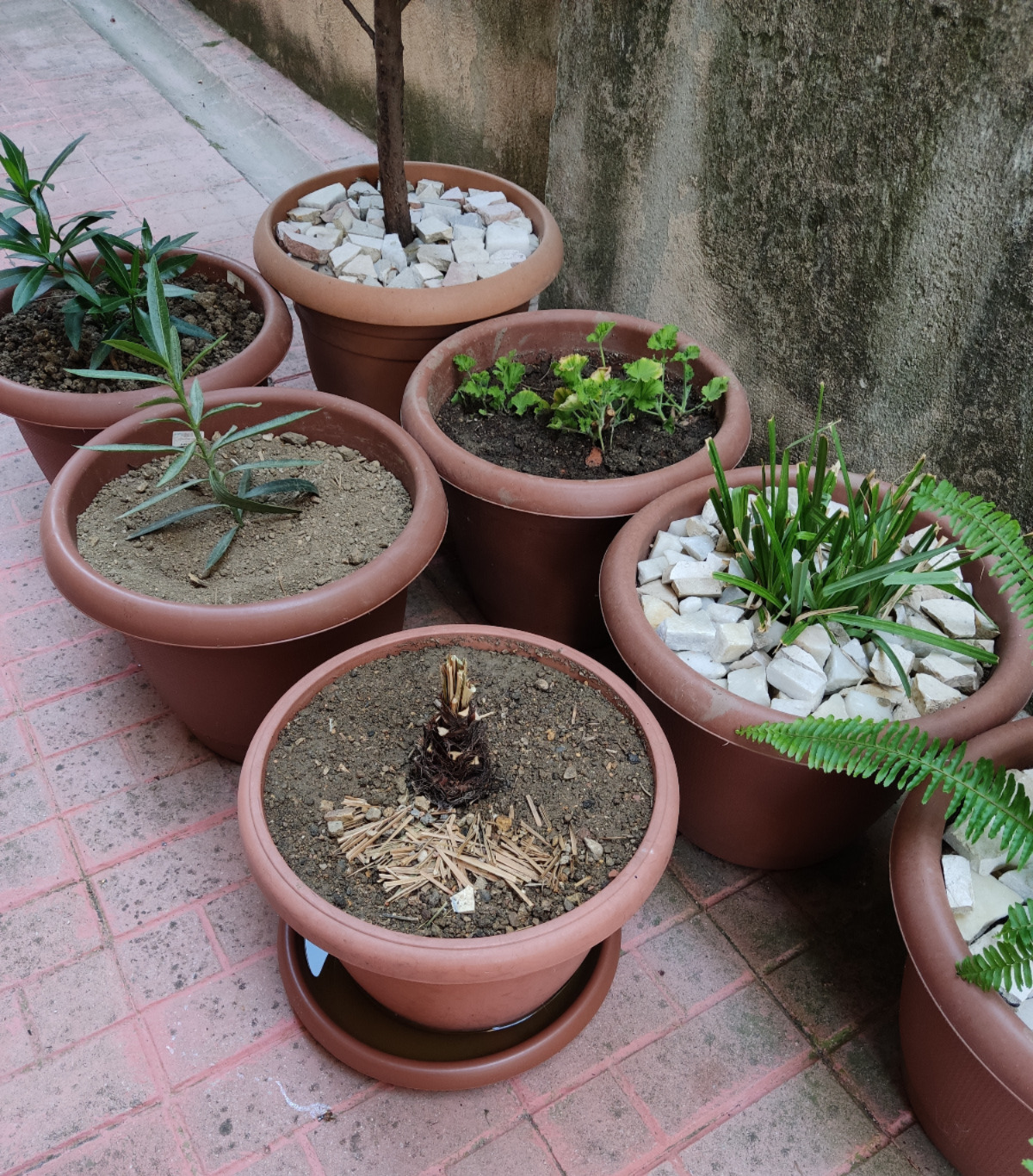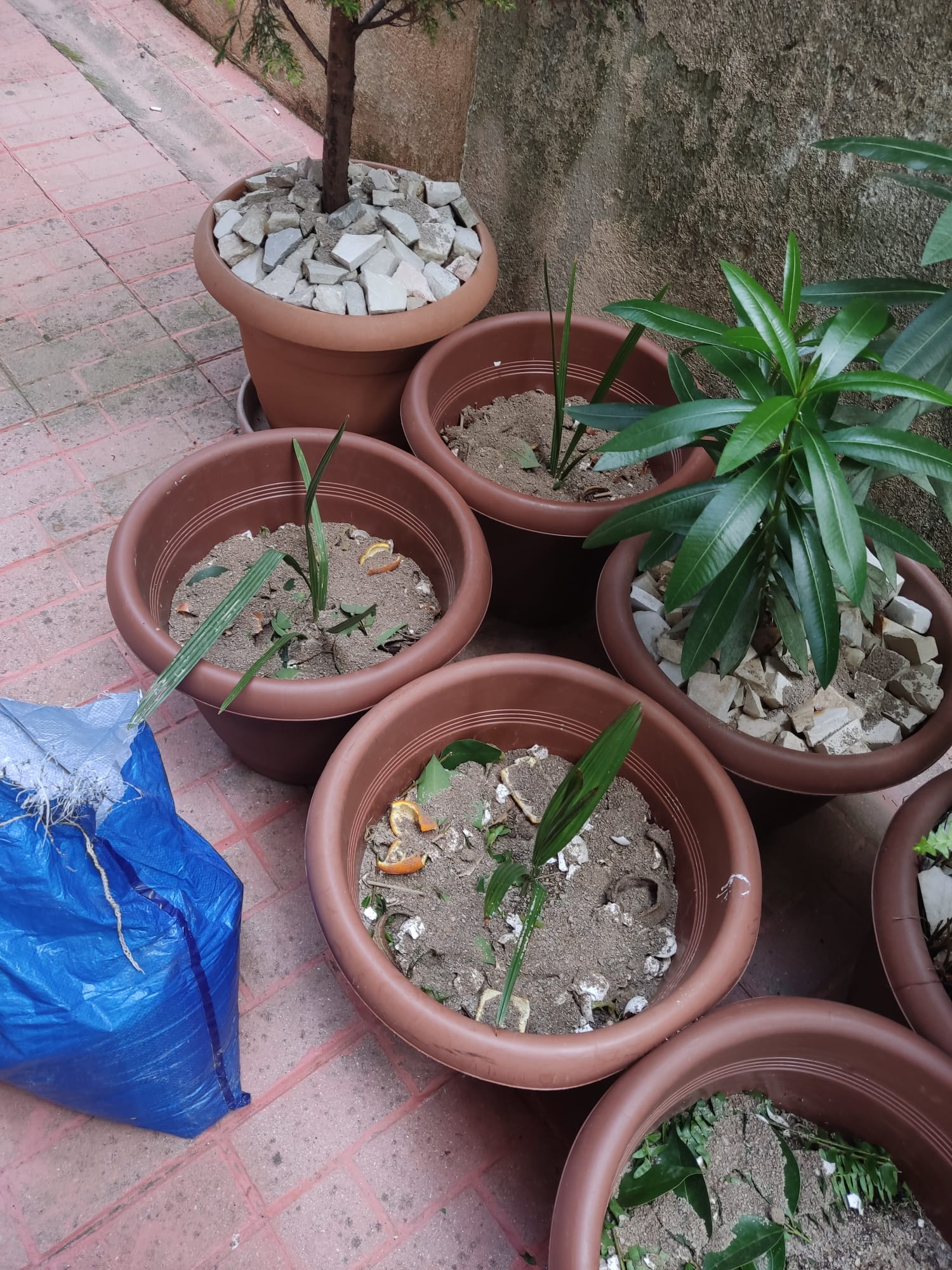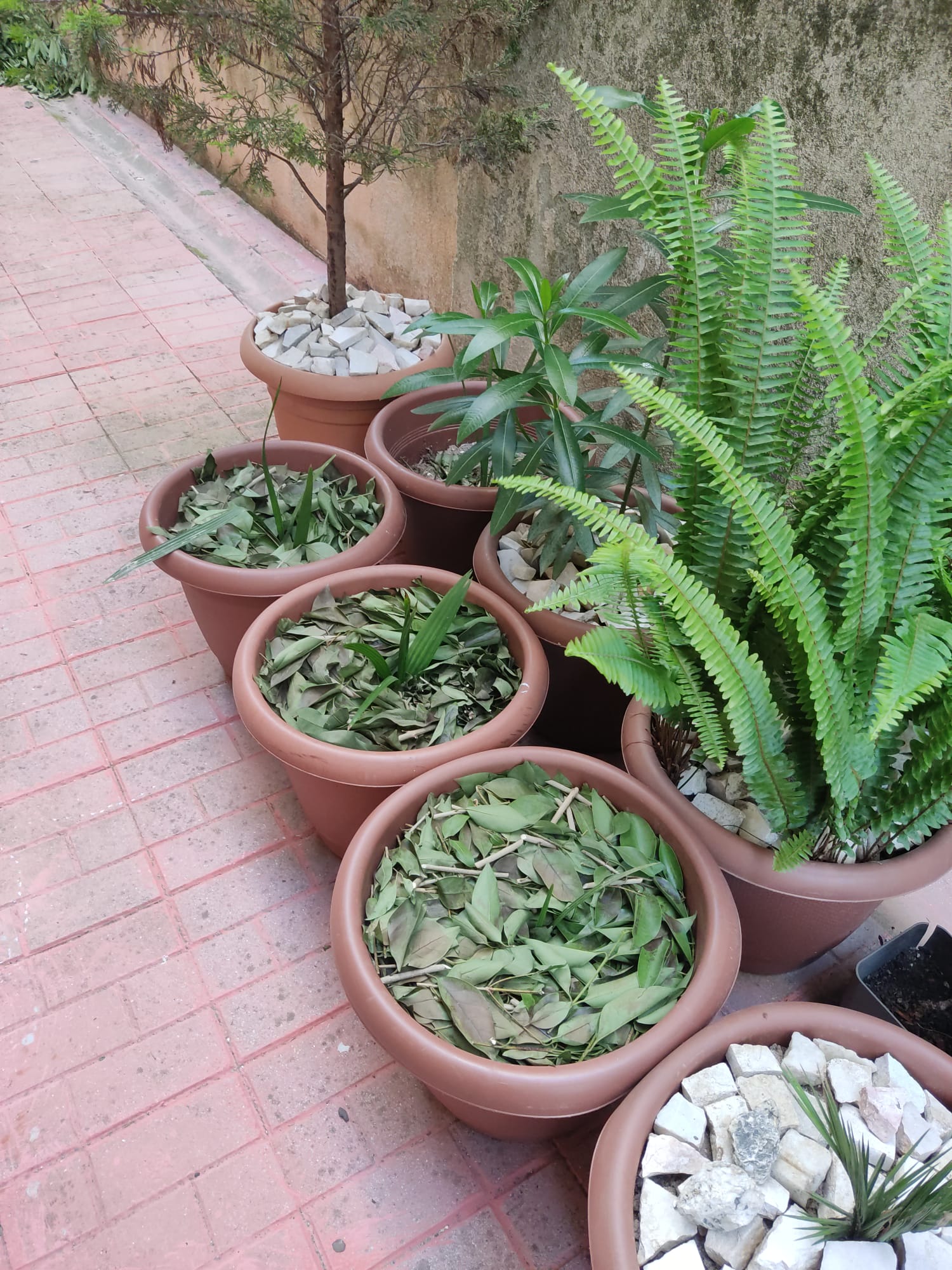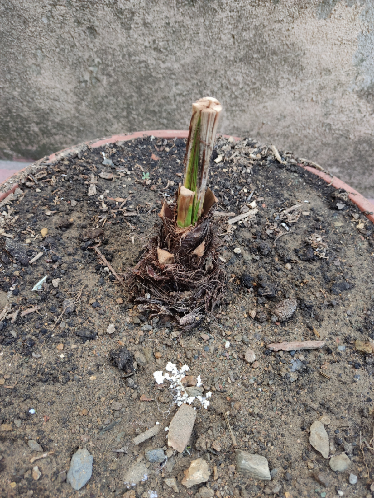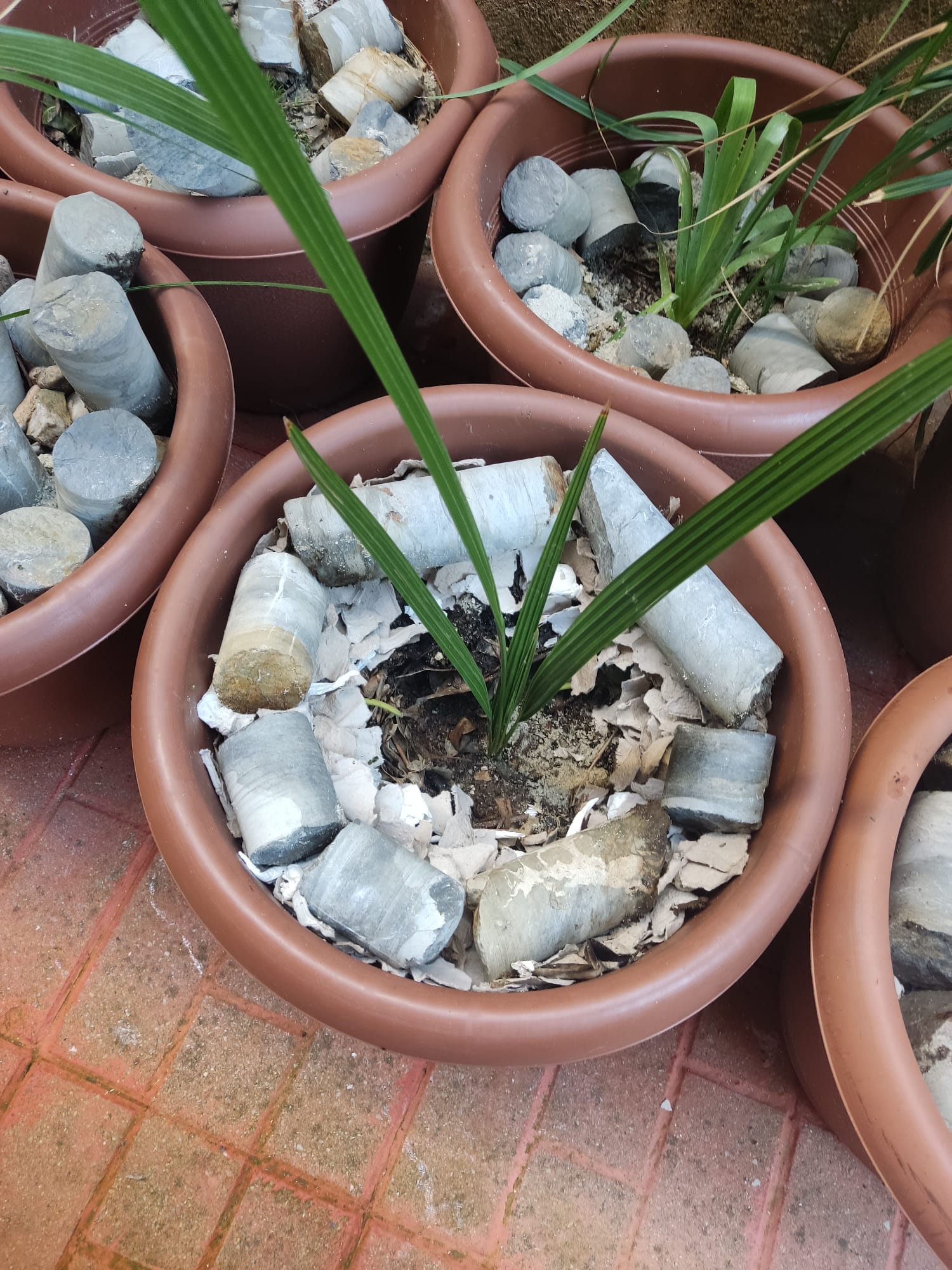 Una de las palmeras me di cuenta que le había sentado mal el transplante y le quité algo de tierra no debería estar tan enterrada al menos hasta que agarre y bueno aproveché para ponerle las hojas también y algunas piedras que le aguanten el agua, pues creo que no la voy a regar en bastante tiempo