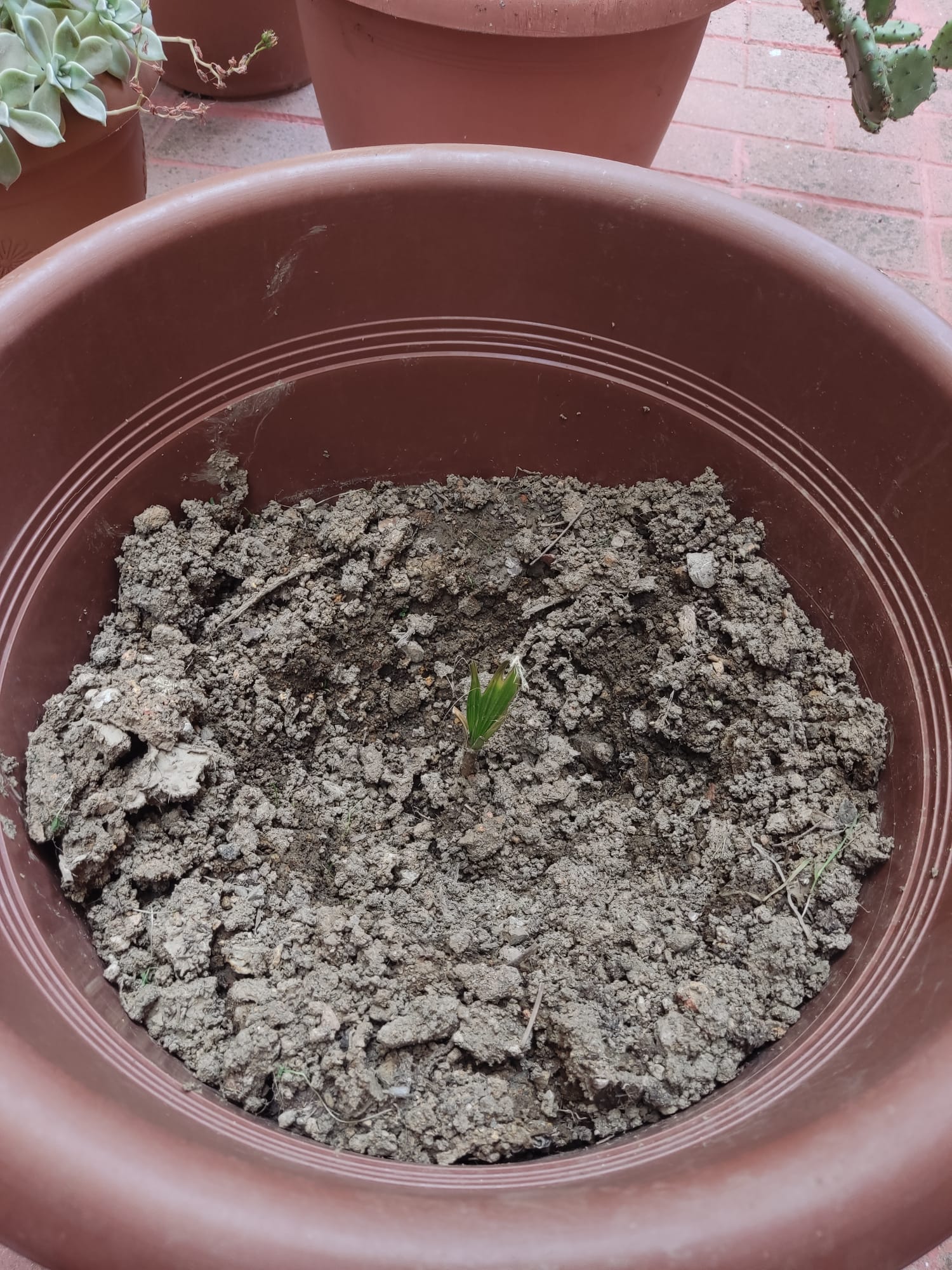 Creo que la palmerita esta con su cráter, luego su arenita, luego sus hojas sus piedras y sin regar desde hace bastantes días la verdad y no se si regar estos días. Está empezando a tirar.
