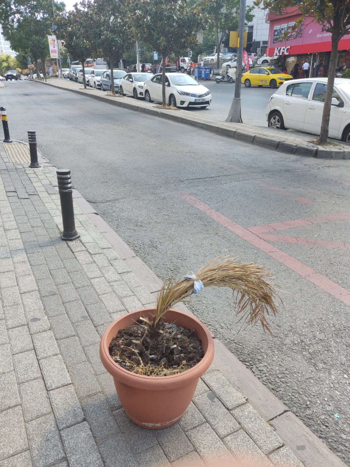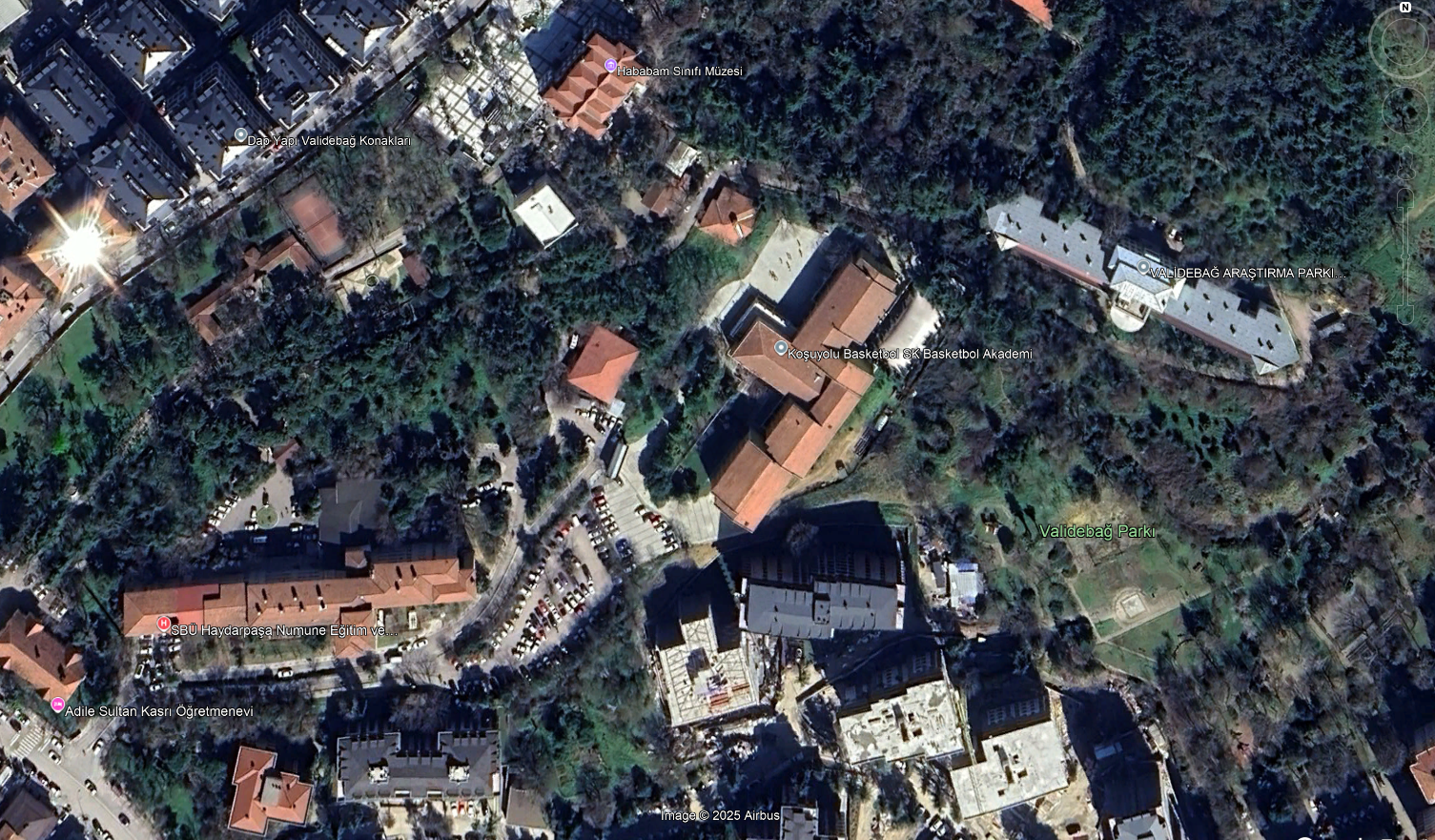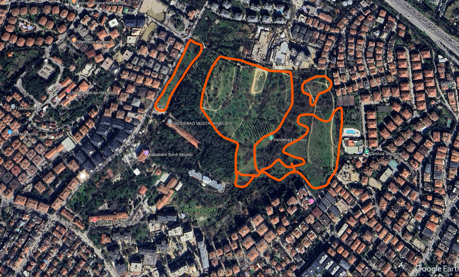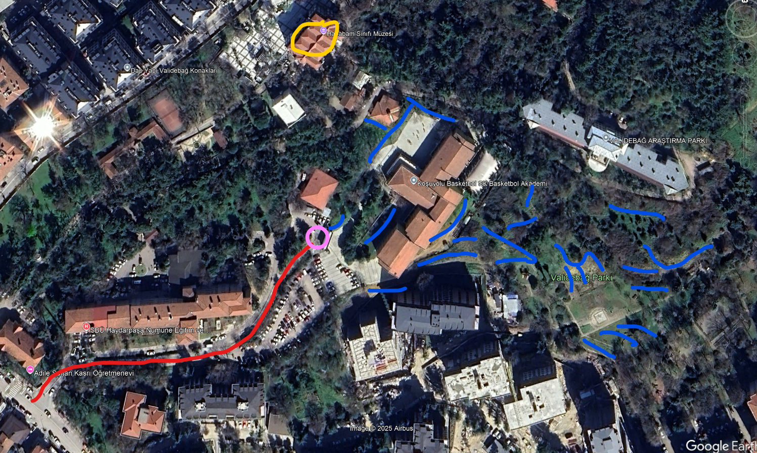 Bueno lo rojo es el camino que hice desde la avenida al lugar que he puesto de google street maps que fue donde entregué las plantas, en el control de seguridad de entrada al instituto que es el círculo rosa. Cuando las entregué me dijeron que había muchísimos lugres libres donde quieren poner plantas que es dentro del recinto del instituto. A ojo he puesto en azul lo que creo que son las zonas donde se pueden poner pero no llegué a entrar a mirarlo ni me lo dijeron ni nada. la marca amarilla es el lugar donde fui a hablar que es un edificio histórico de la época otomana y se encargan de administrar el parque que está a su alrededor y mas arriba no se ve pero es mucho mas extenso, inicialmente iba a poner las palmeras en ese parque pero me dijeron que era mejor que se las diera al instituto. También envié las crias de agaves que salieron este año.