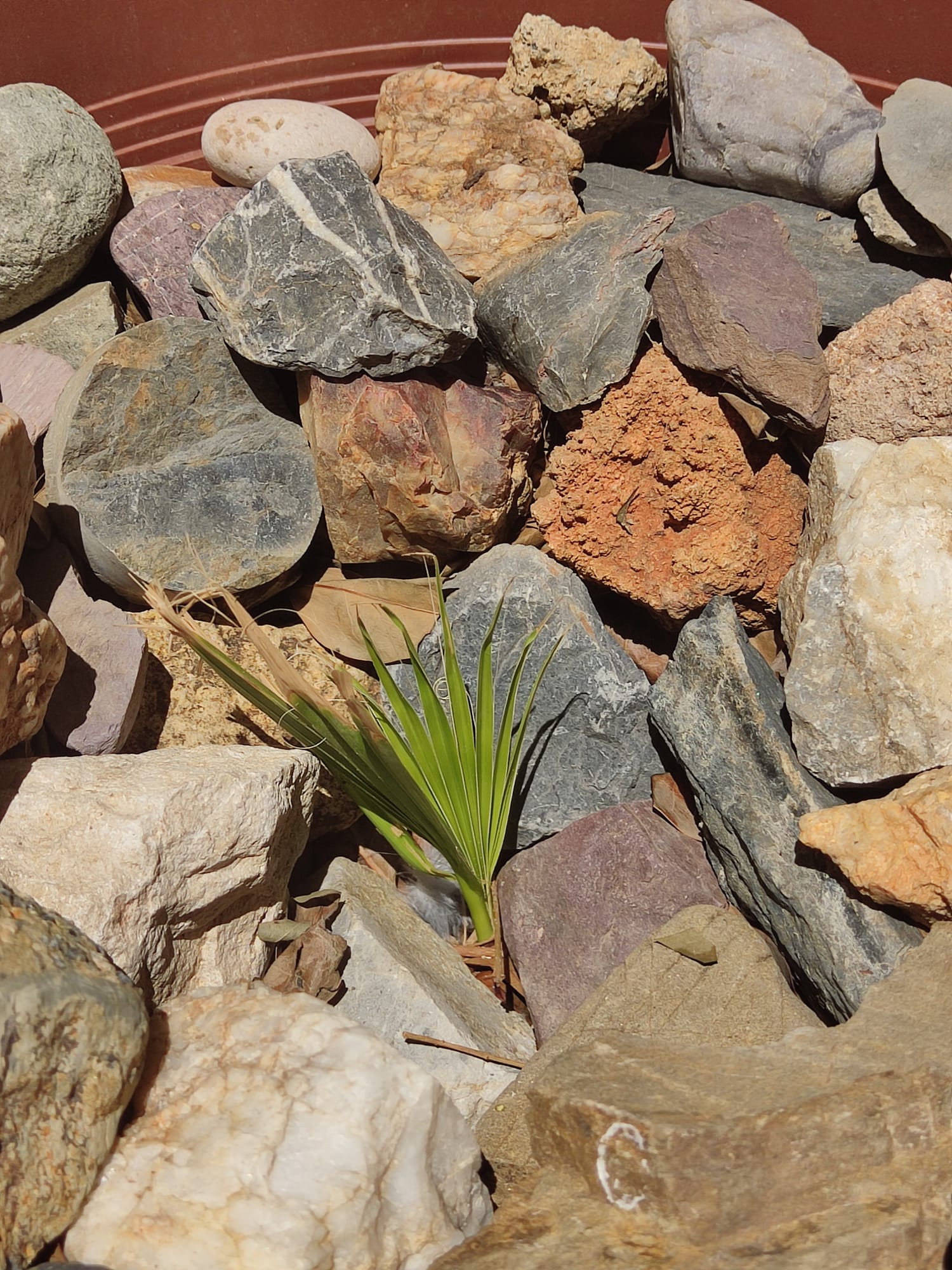 Eso es después de la foto que puse en el diario suculento del tronco que traje de España luego le puse algunas hojas no muchas y las piedras. Tiene forma de crater porque a esta no me atreví a enterrarla, le sentó mal ya quedará para mas adelante, si sobrevive cuando agarre algo de fuerza ya le echaré tierra, es una Washingtonia filifera.