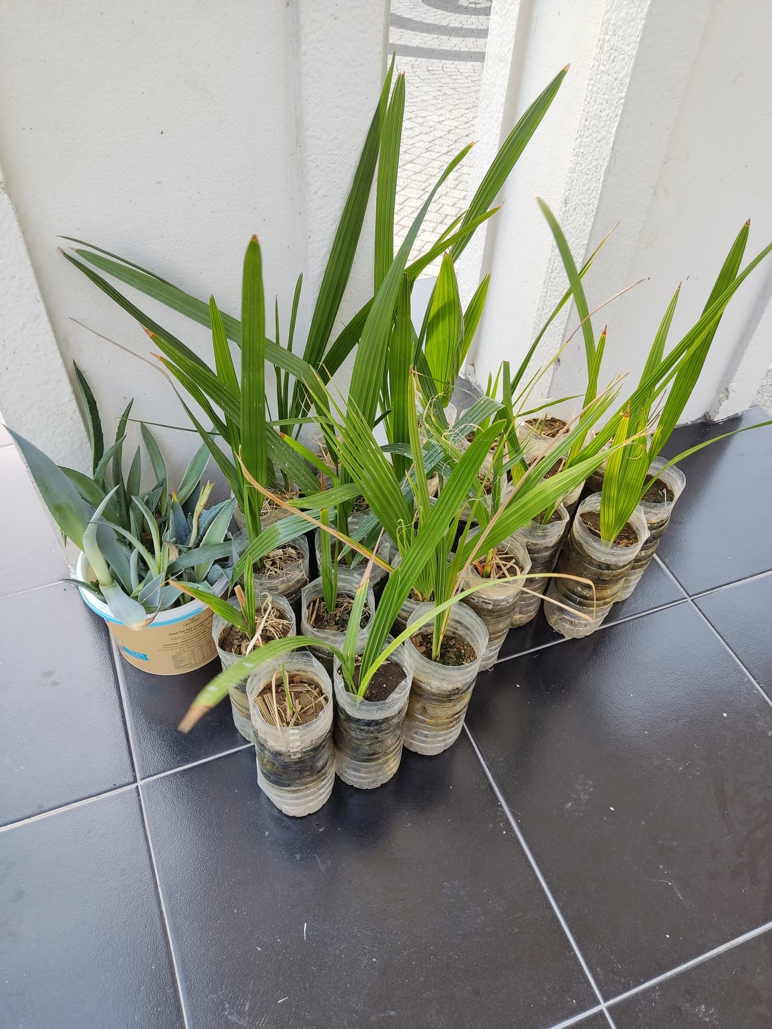 Yo tenía 25 palmeras metidas en botellas y no sabía ni donde ponerlas pero bueno después de una carambola que no viene a cuento me dejaron llevarlas a un instituto y las van a plantar ahí.