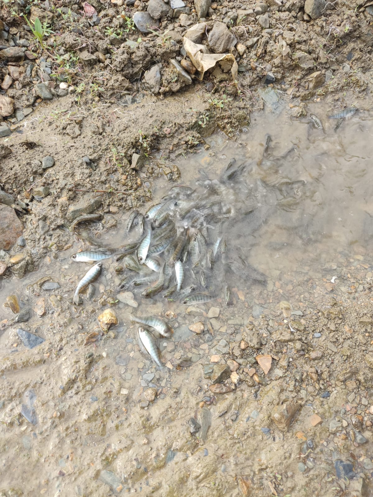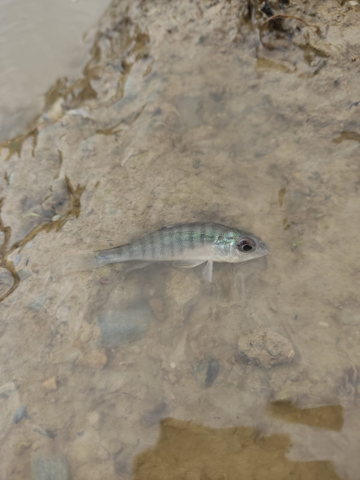 Eso son las percas, no entendimos muy bien, yo me volví loco y empecé a sacarlos de los charcos y a tirarlos al rio pero muchos volvian a los charcos, parece como si pudieran estar ahi y luego saltar y salirse fuera y volver al rio entonces echamos muchos al rio porque mucha gente se unió pero dejamos como un tercio donde estaban y no entendimos nada realmente.