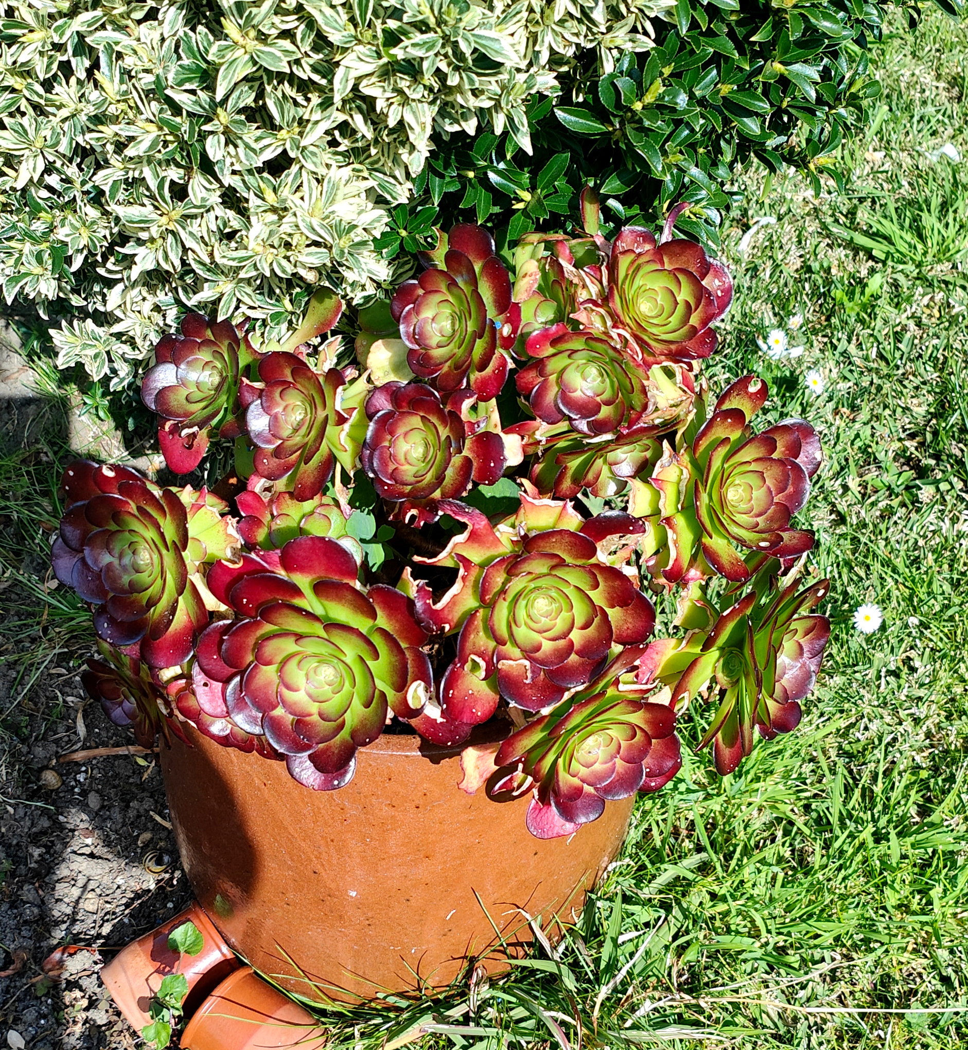 El Aeonium Velour está en el jardin no le hago caso, si llueve pues mejor para él , si graniza pues peor, pero lo peor de lo peor es una invasión de caracoles. Y hace como un mes le he llenado de caracolicida y me lo ha agradecido