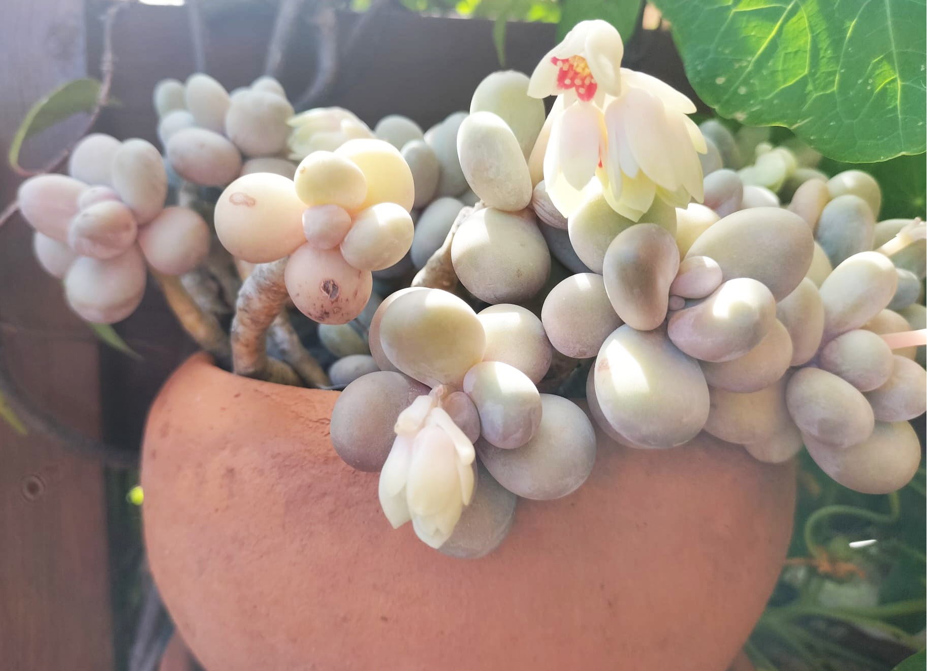 Habría que trasplantarla pero creo que no lo va a hacer porque en seguida se caen sus redondas hojas, dejando pelado el tallo, lo cual es una lástima.