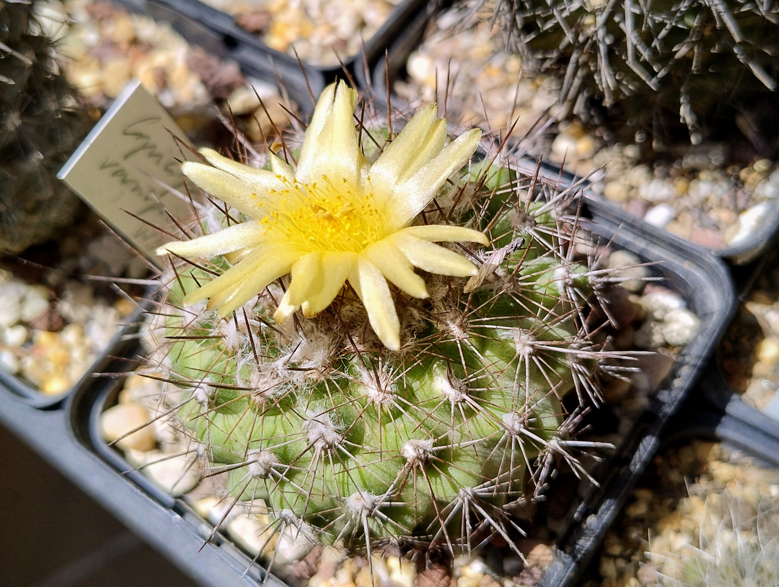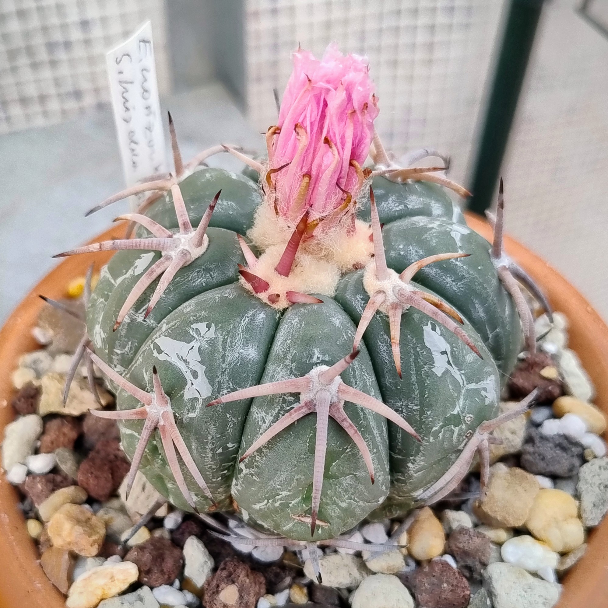 Mi planta del día para el martes va a ser este Echinocactus horizonthalonius. La primera vez que florece, aunque me la perdí