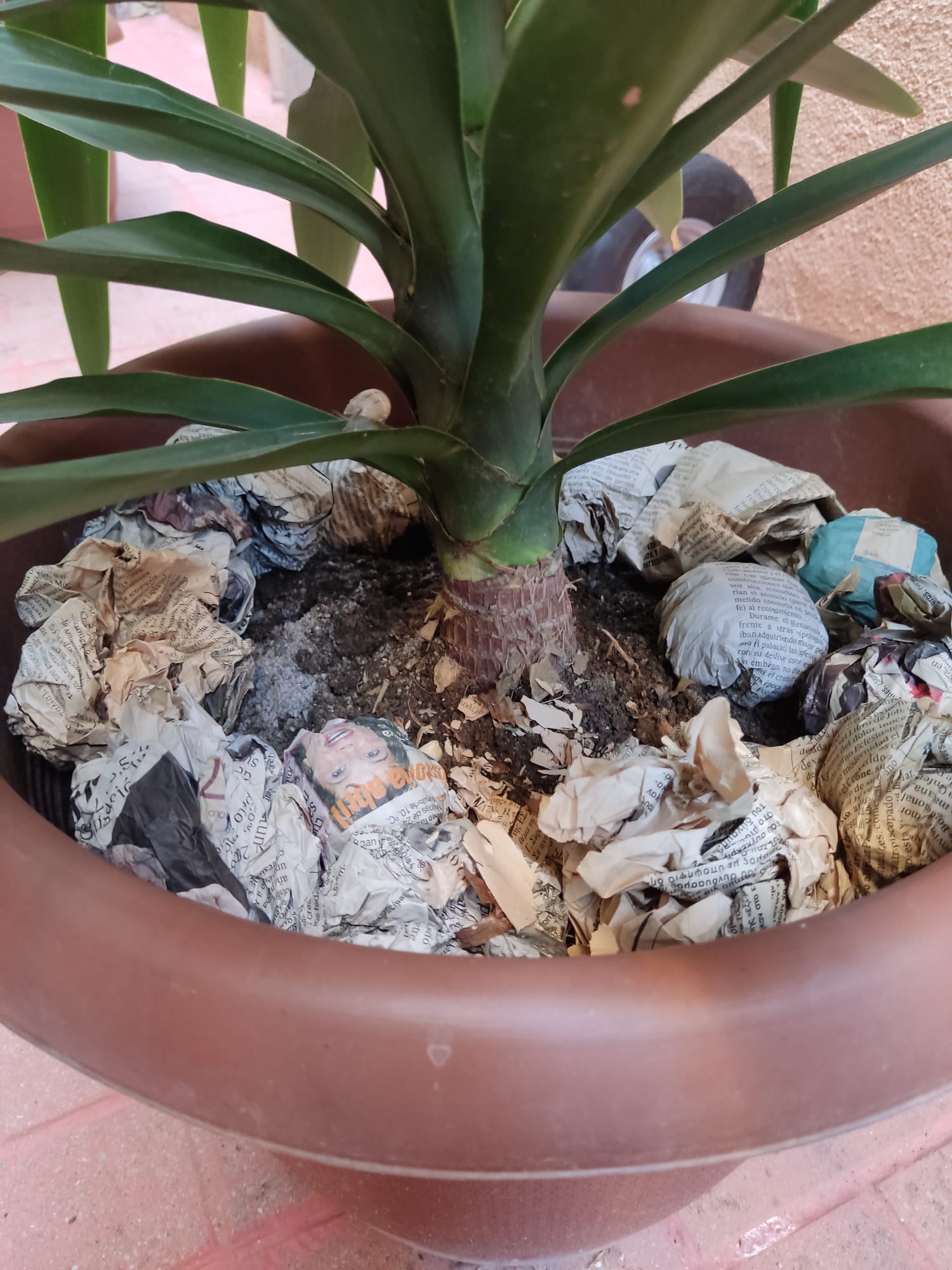 Esta planta, veis todo lo que tiene? encima luego le puse sus propias hojas cortadas de la poda. Se ven a un lado en la foto.