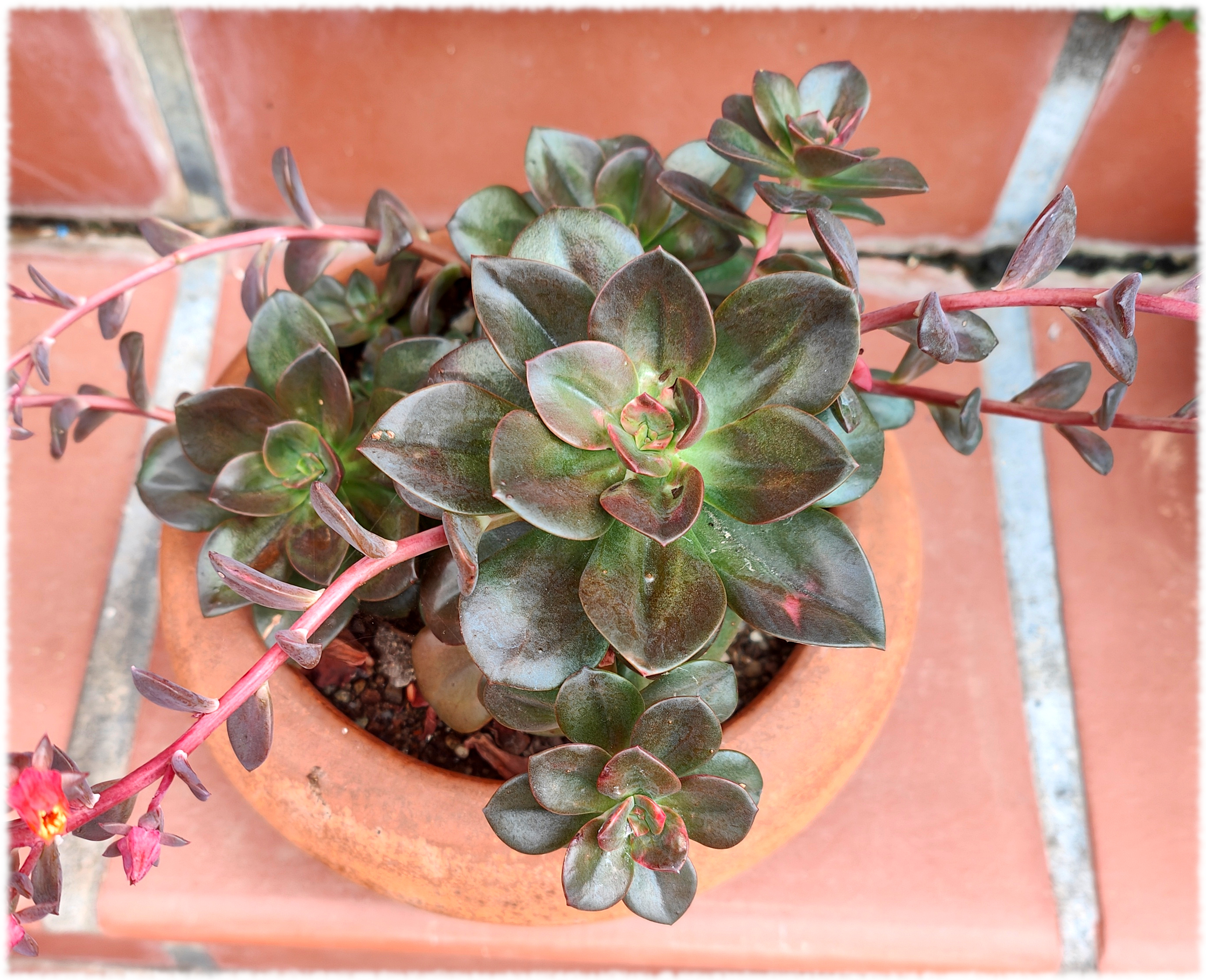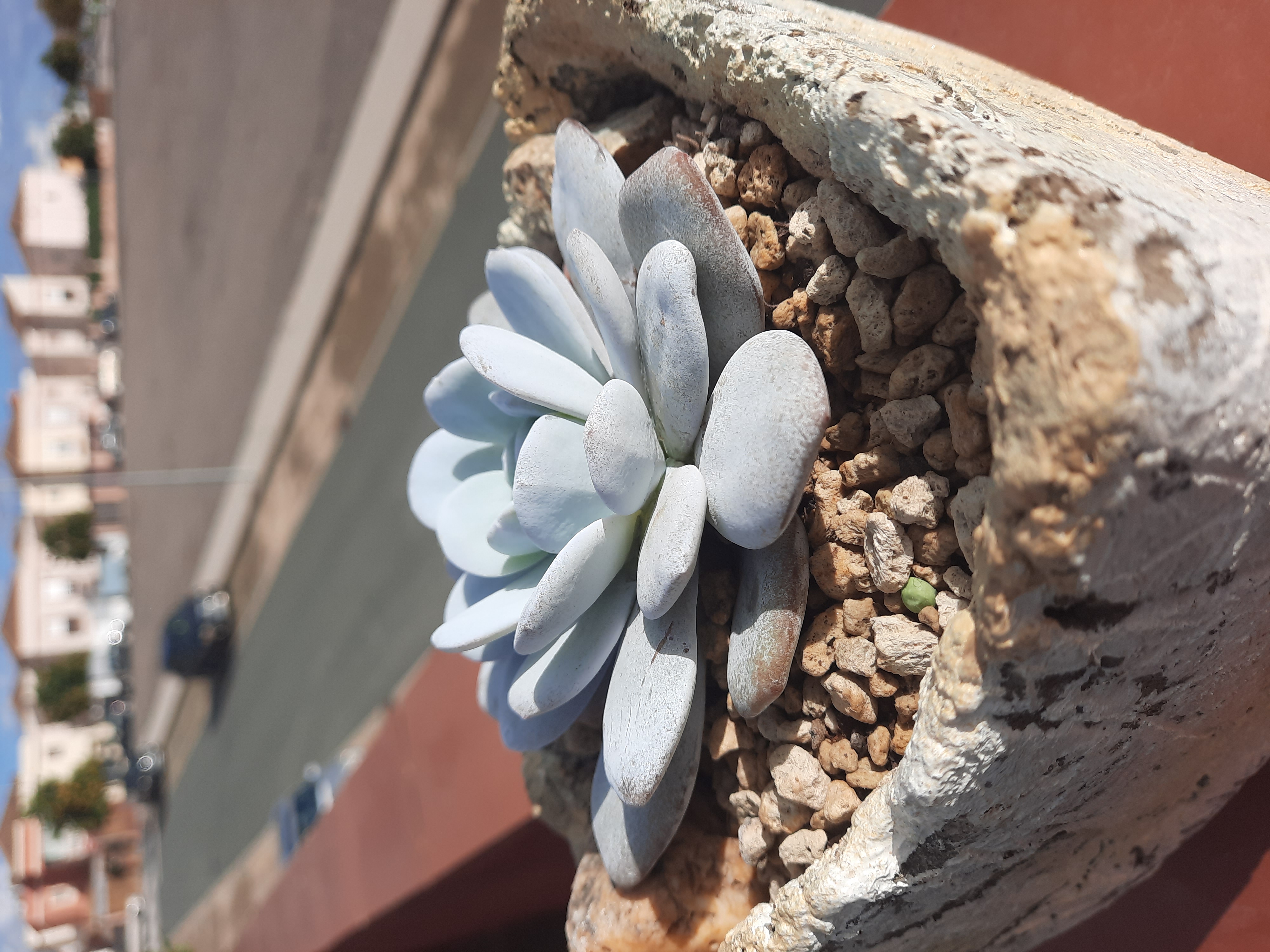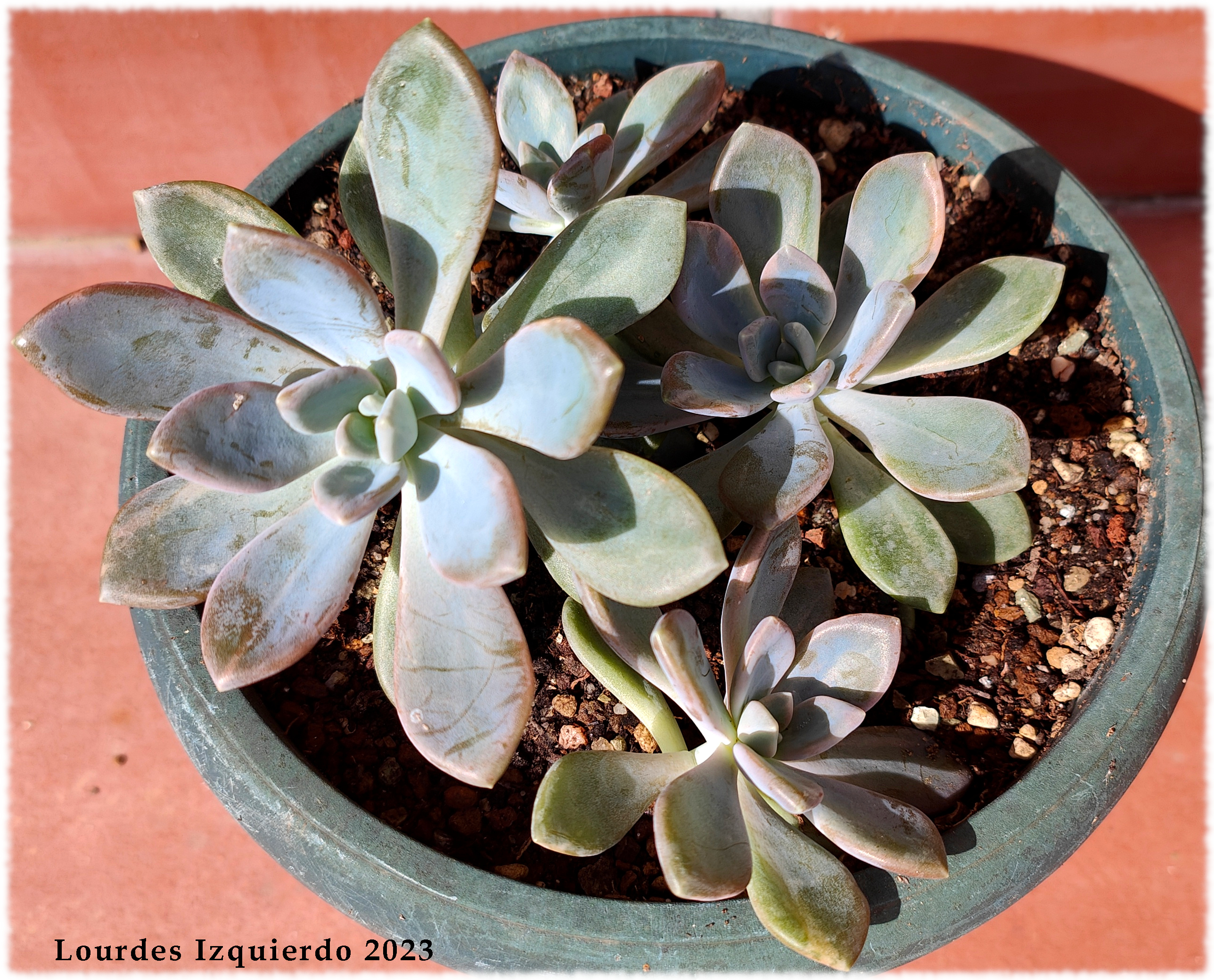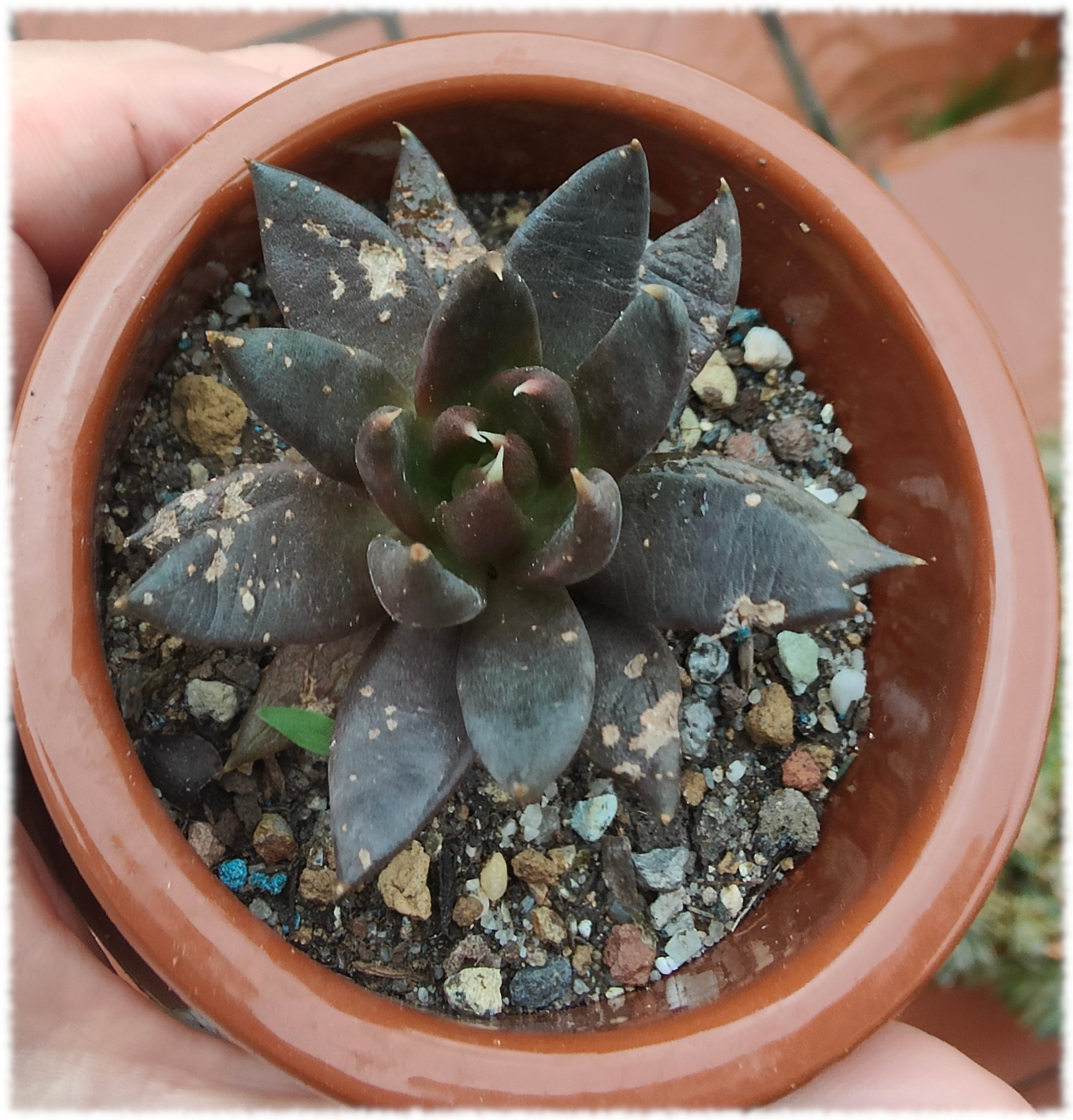 Esta planta proviene de un usuario francés ( Thomas) del antiguo foro de ICN que también lo seguía en Flickr y es una planta que nació en su casa probablemente un cruce entre Graptopetalum paraguayense y alguna Echeveria.