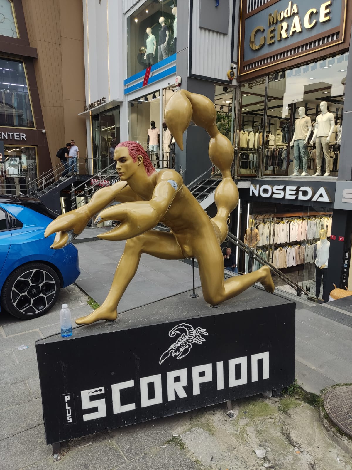 Esto lo he encontrado en una zona industrial textil comercial, no sabría como definirlo. Se supone que es un escorpión. No se a quién se le ocurrió esto y como eso es legal en público, jajajaja. (Estambul, Turquía).